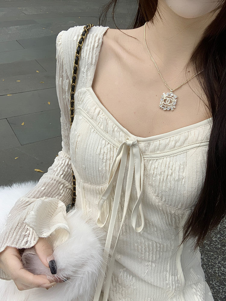 “雾漫白茶”新款秋冬拼接蕾丝时尚连衣裙方领收腰修身长裙女