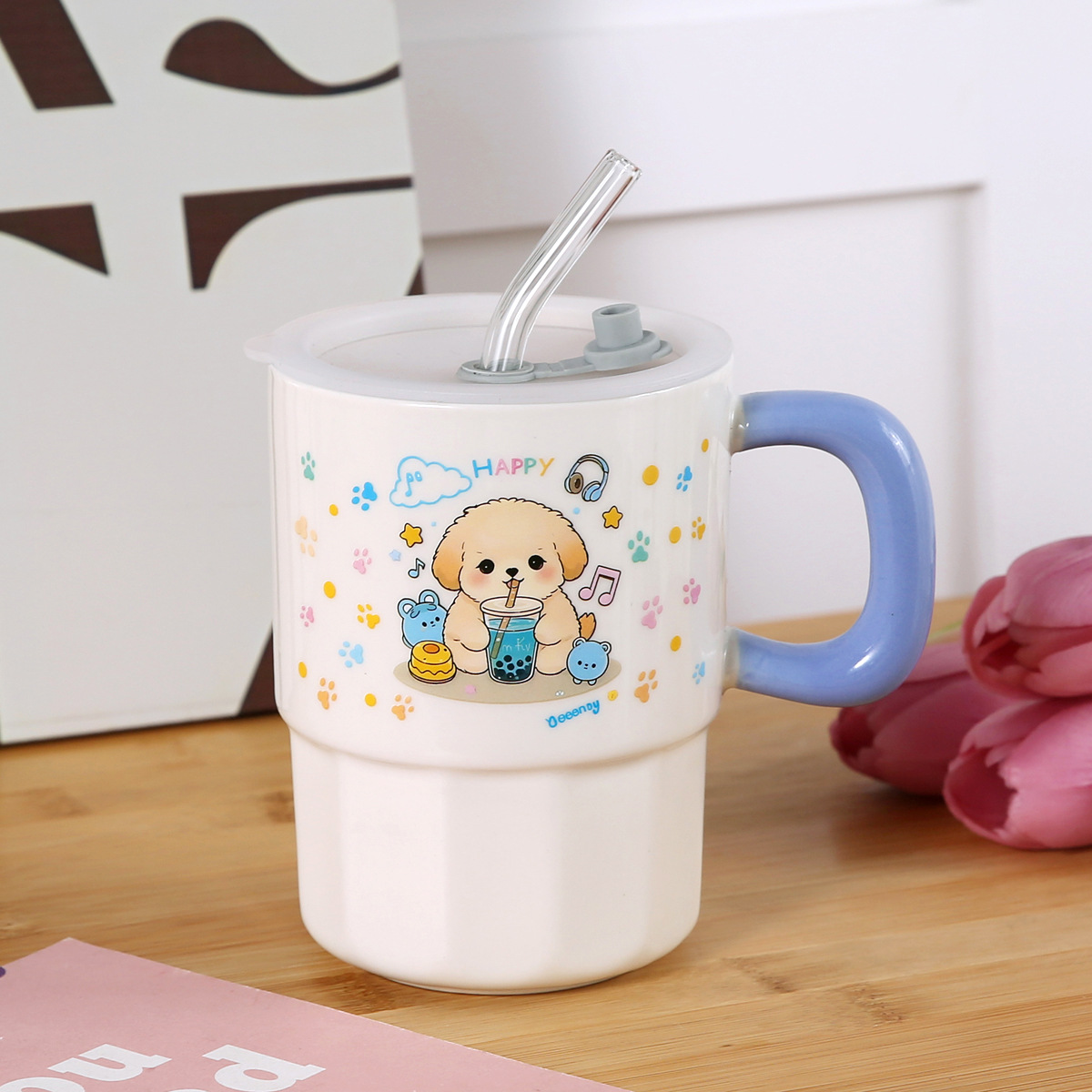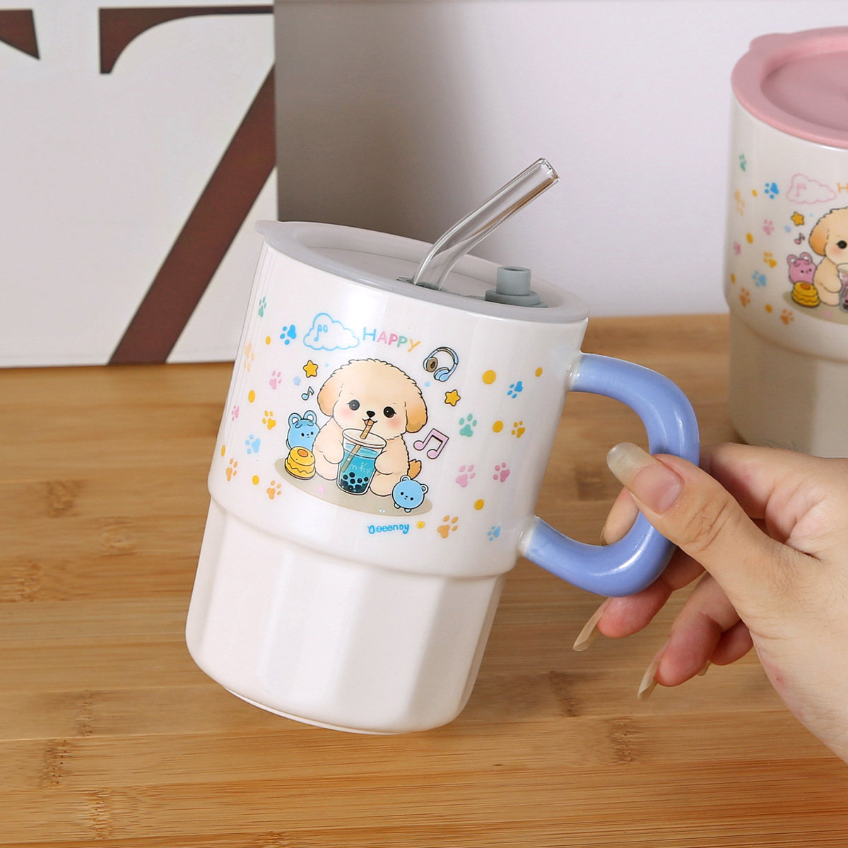 可爱波点小狗吸管杯子带盖高颜值情侣马克杯家用陶瓷水杯生日礼物