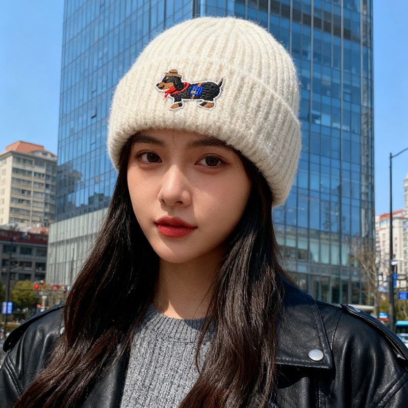 韩版小狗贴布破洞帽子女秋冬季加厚保暖毛线帽可爱针织护耳包头帽