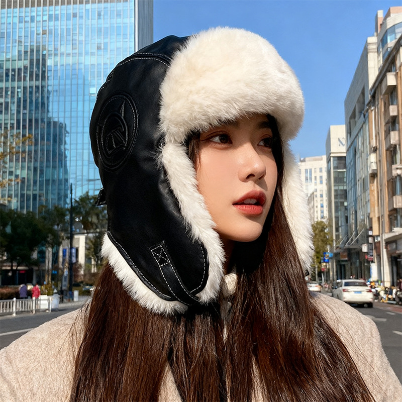 雷锋帽子女秋冬加厚保暖PU皮质毛绒帽户外滑雪防寒护耳帽飞行帽潮