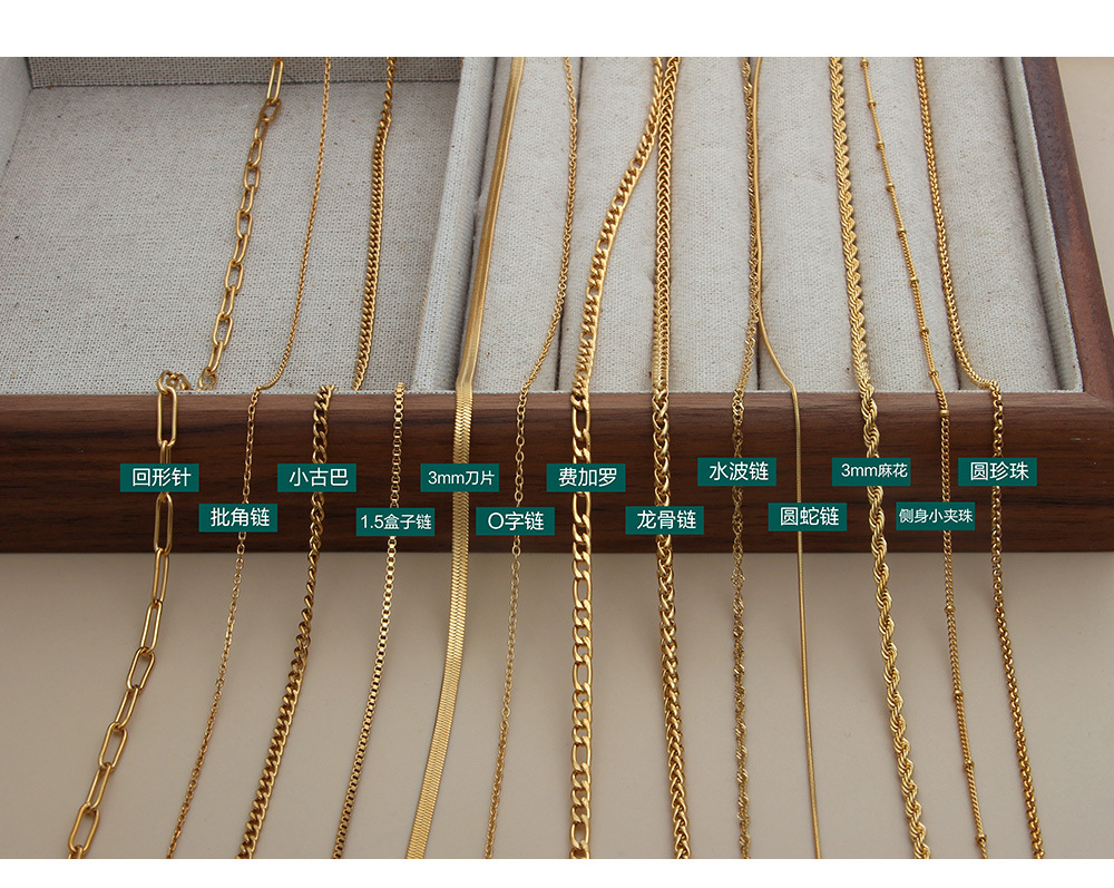 颜色 金色1.5盒子链,金色3mm刀片链,金色O字链,金色侧身小夹珠,金色费加罗,金色4mm回形针,金色龙骨链,金色3mm麻花链,金色批角链,金色水波链,金色小古巴,金色圆蛇链,金色2mm圆珍珠