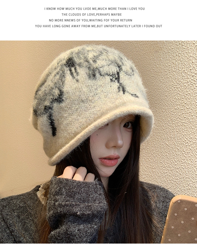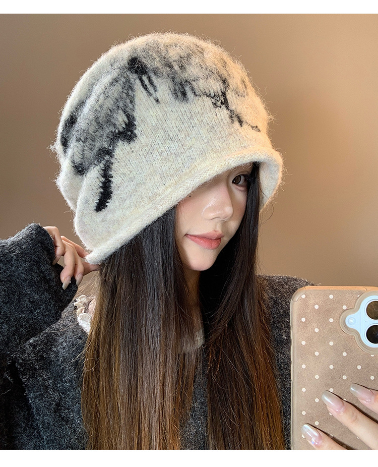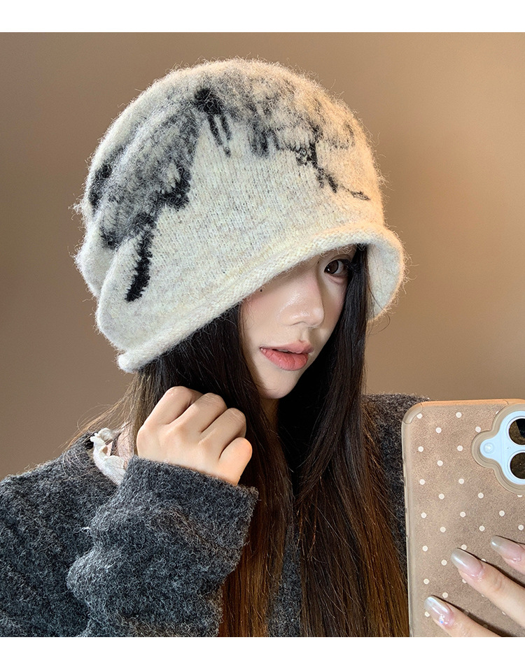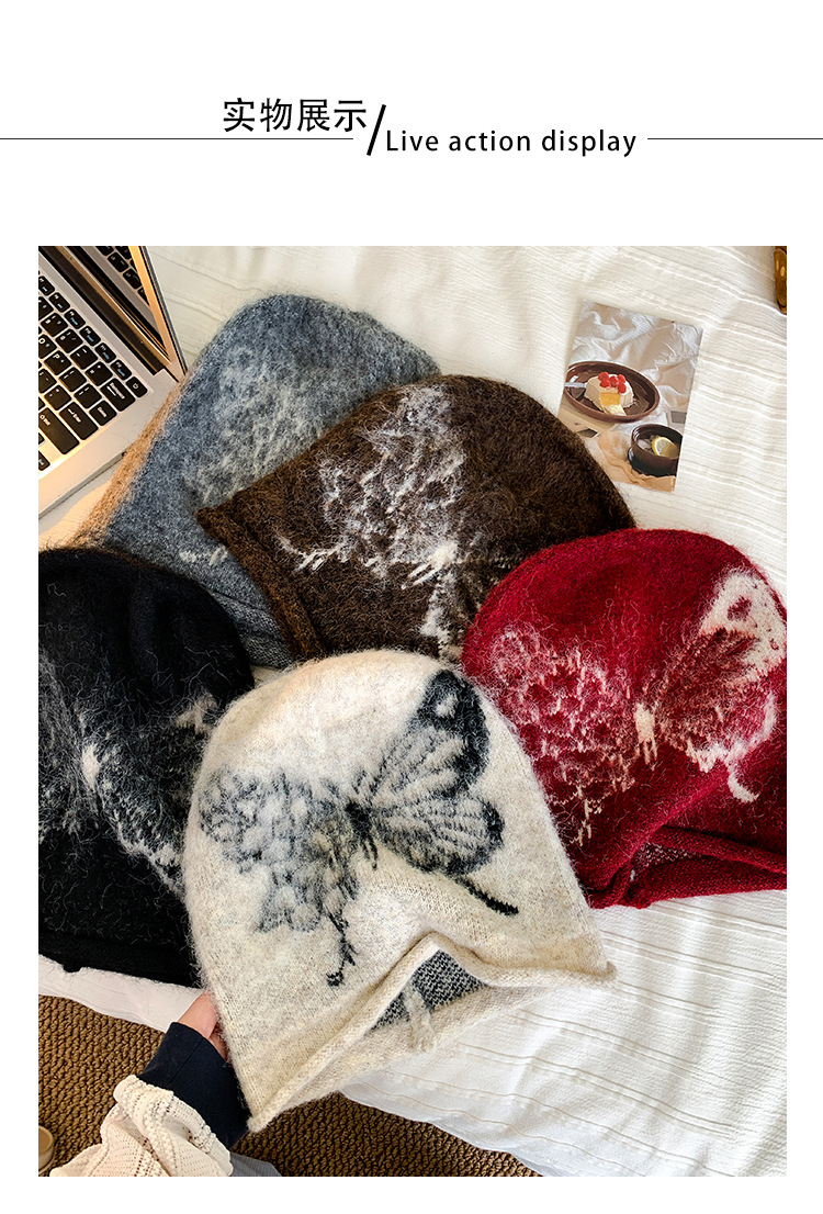 韩版复古蝴蝶印花堆堆帽女冬季防寒保暖护耳针织毛线帽子包头冷帽