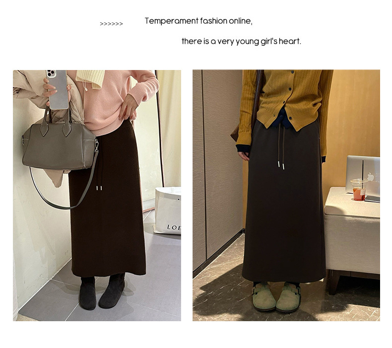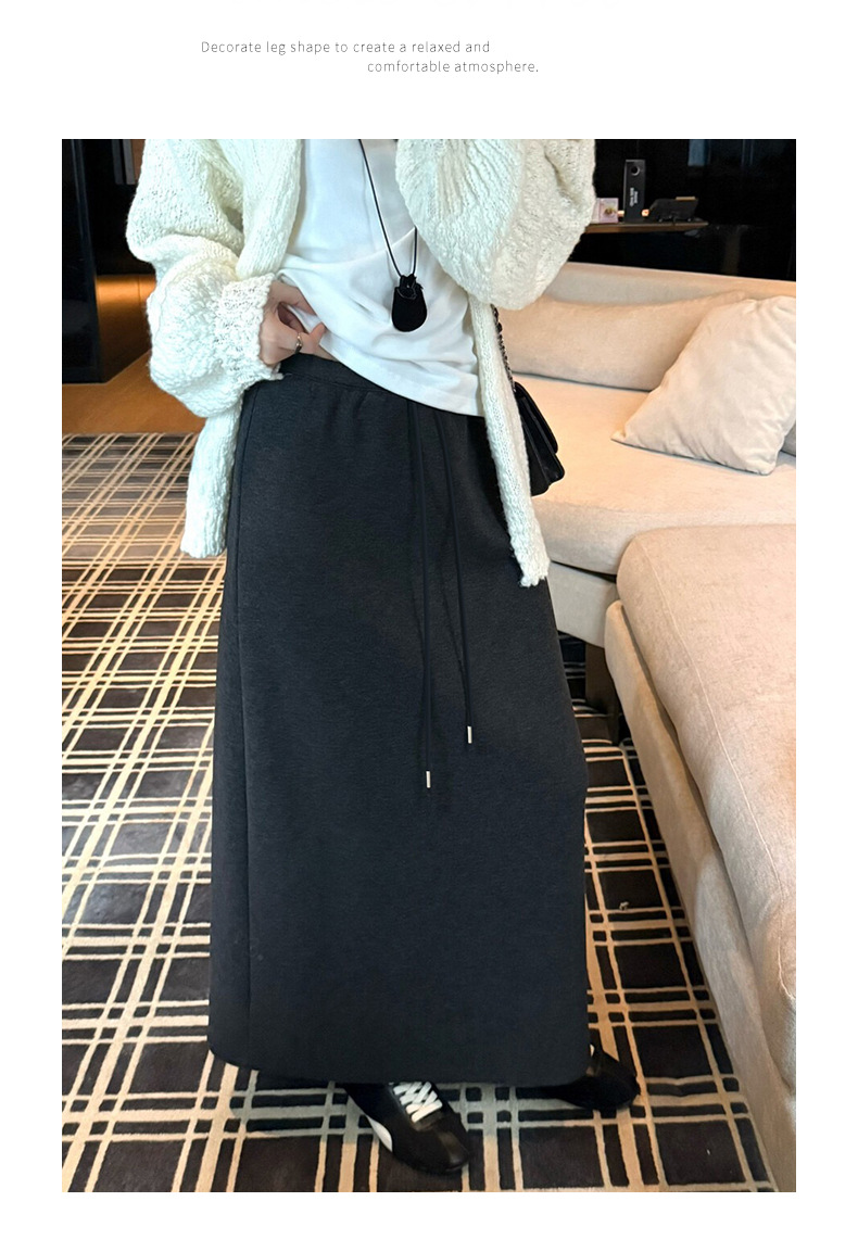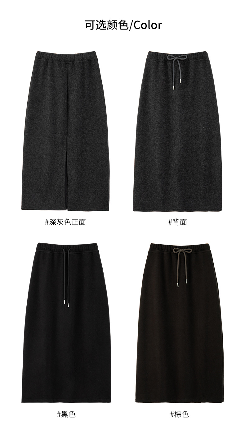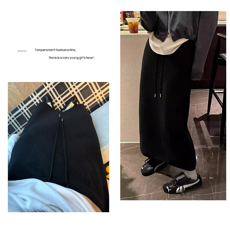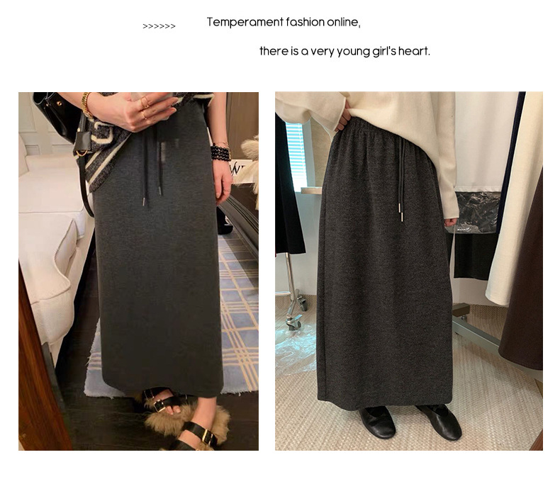 灰色设计感开叉针织半身裙女秋冬松紧腰抽绳百搭裙子中长款直筒裙