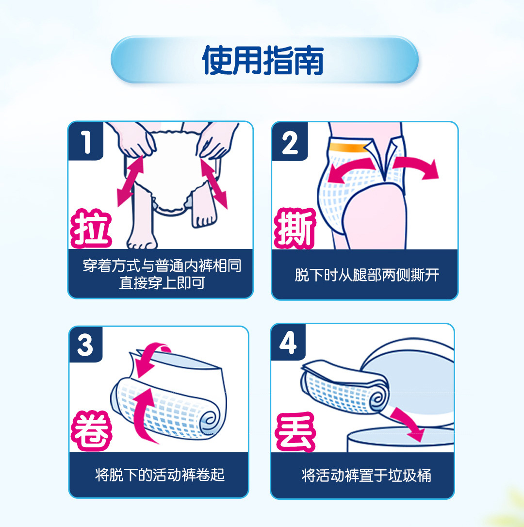 规格 D7401【包大人轻薄贴身活动裤】M码*11片/包,D7402 【包大人轻薄贴身活动裤】L码*11片装/包,D7405【包大人轻薄贴身活动裤】XL码*10片装/包