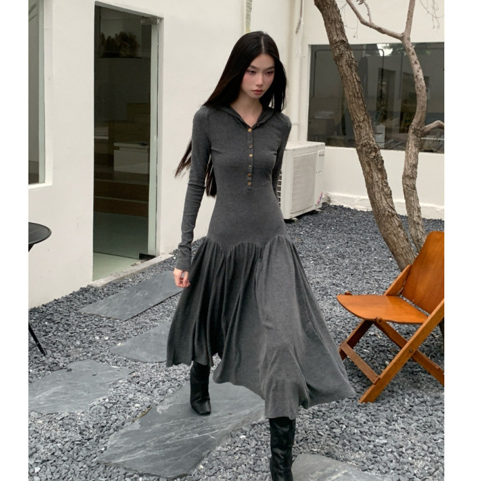 不规则扣子装饰绒感坑条针织连帽连衣裙