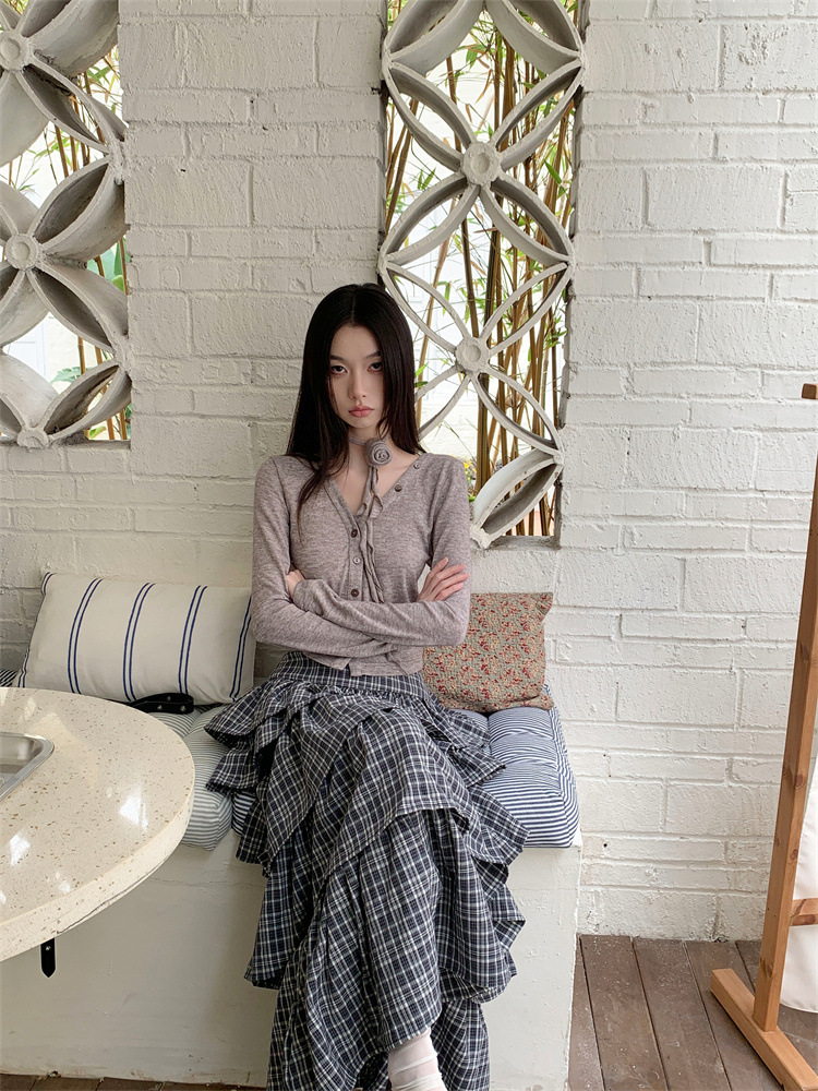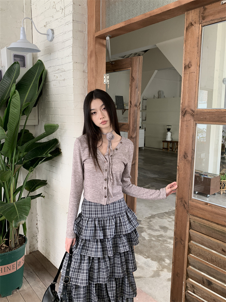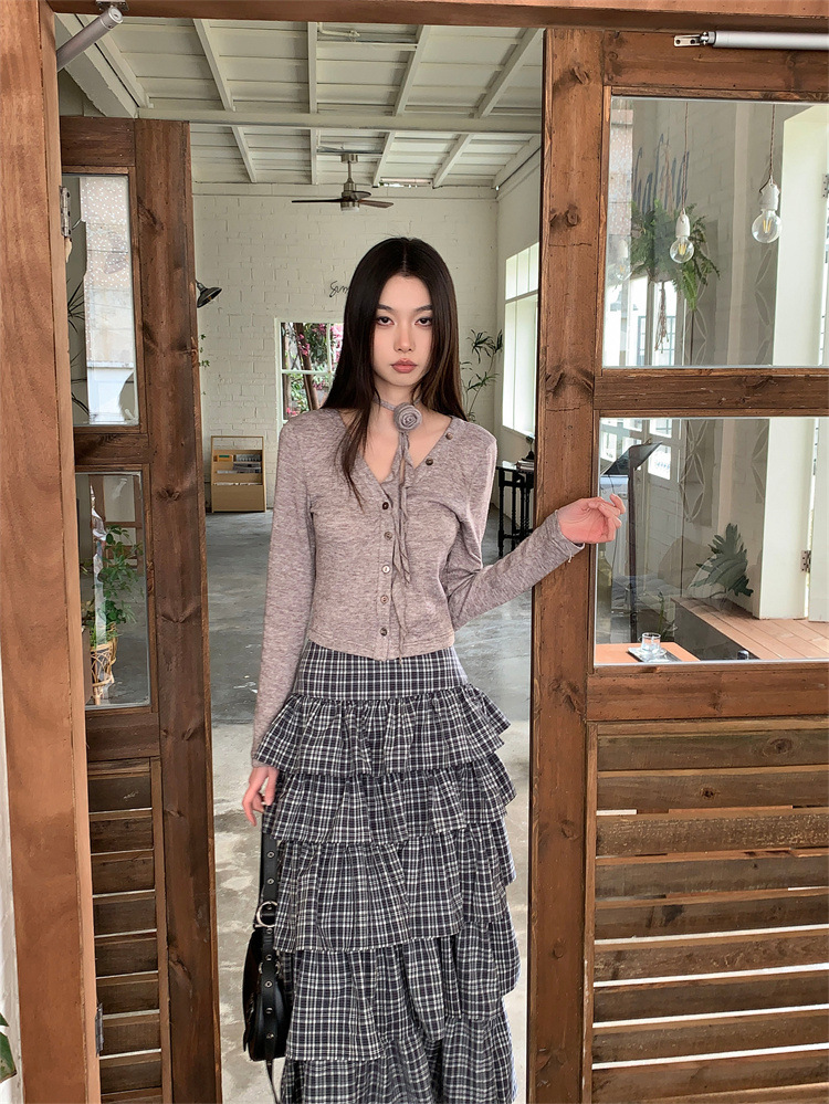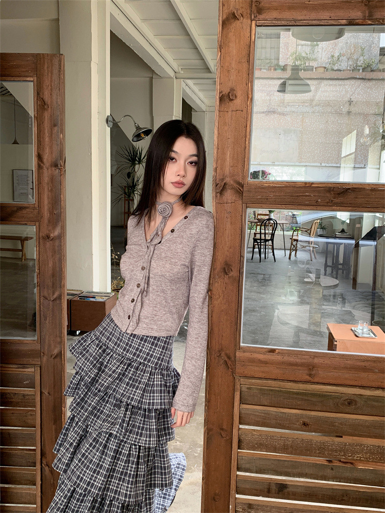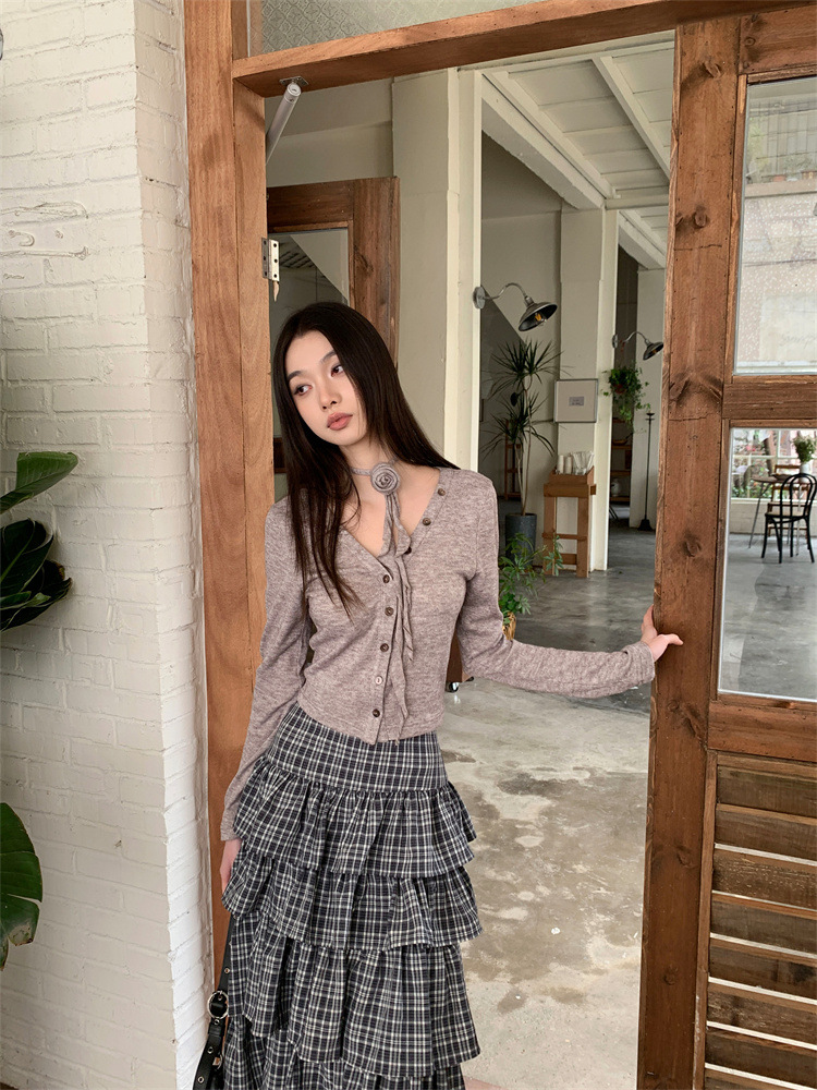 秋冬新款灰紫色上衣v领开衫修身内搭打底衫女