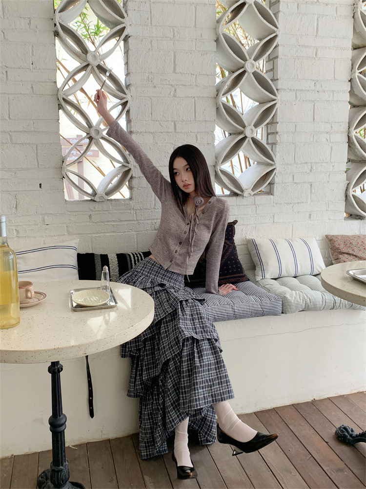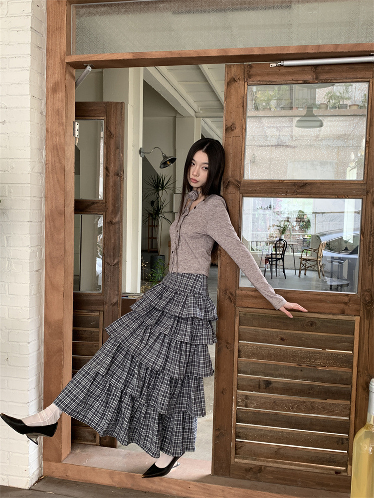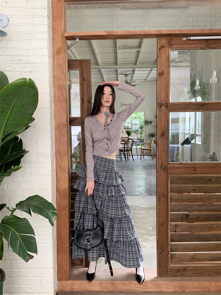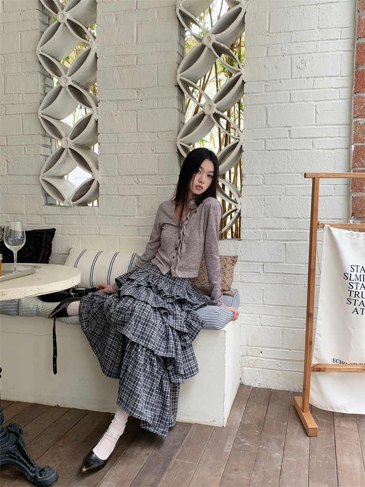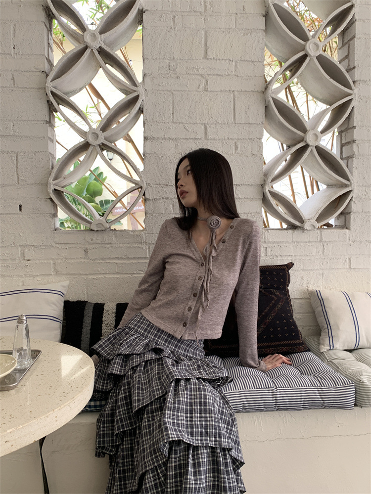 現物のデザイン感のある襟のタックのカーディガンの上着はゆったりしています。