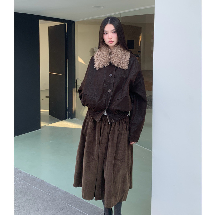 可拆卸毛领水洗皮衣女款做旧翻领外套