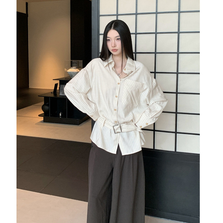 新款女装收腰条纹衬衫秋设计感小众长袖复古上衣