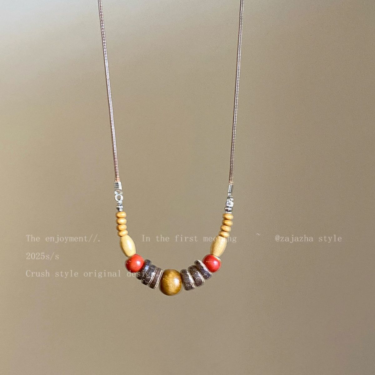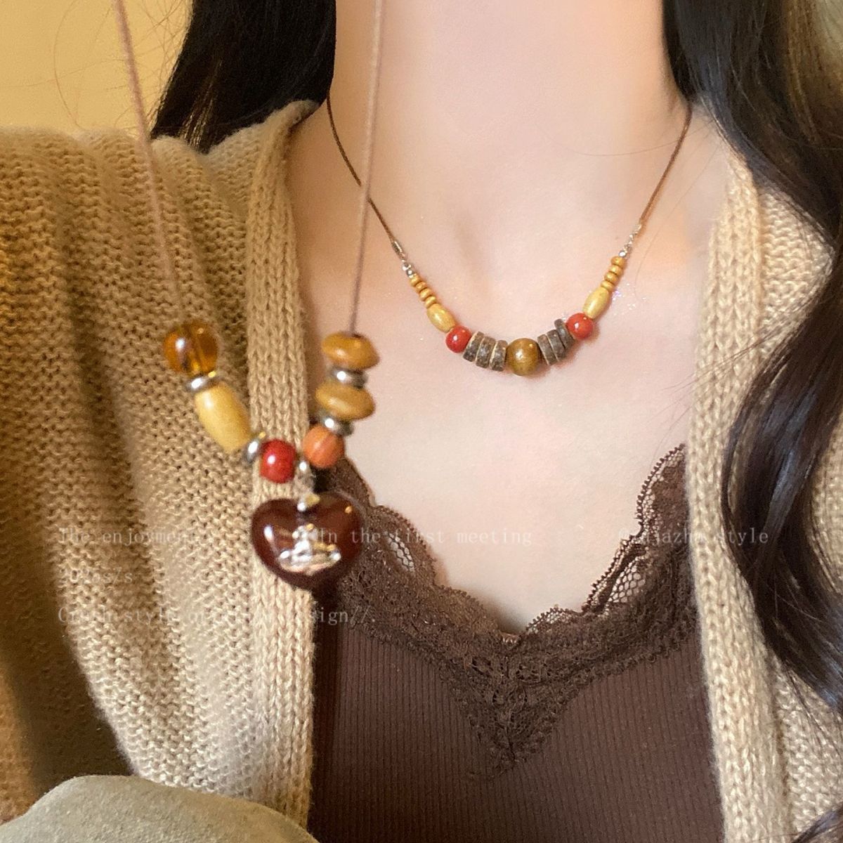 复古木质串珠吊坠项链女小众设计感民族风配饰时尚长款百搭毛衣链