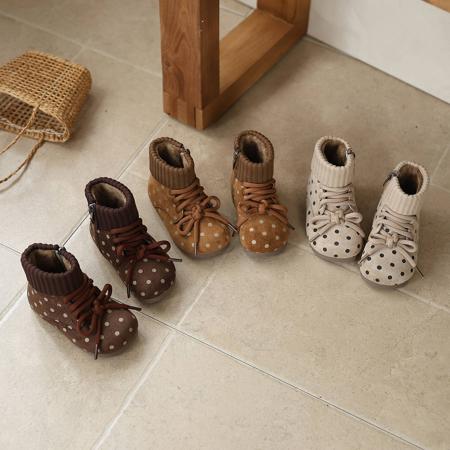ins法式勃肯靴2025冬季新款韩版女童复古波点毛线口绒面加绒短靴