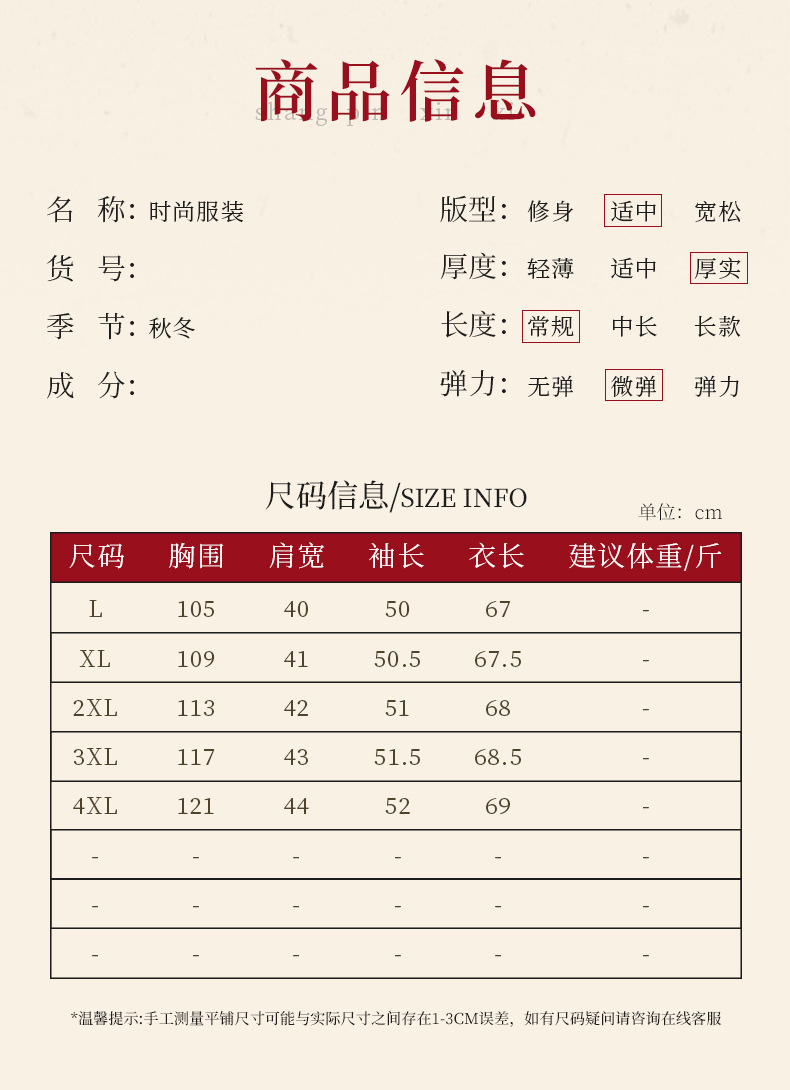 尺码 L建议90-120斤,XL建议120-140斤,2XL建议140-155斤,3XL建议155-165斤,4XL建议165-180斤