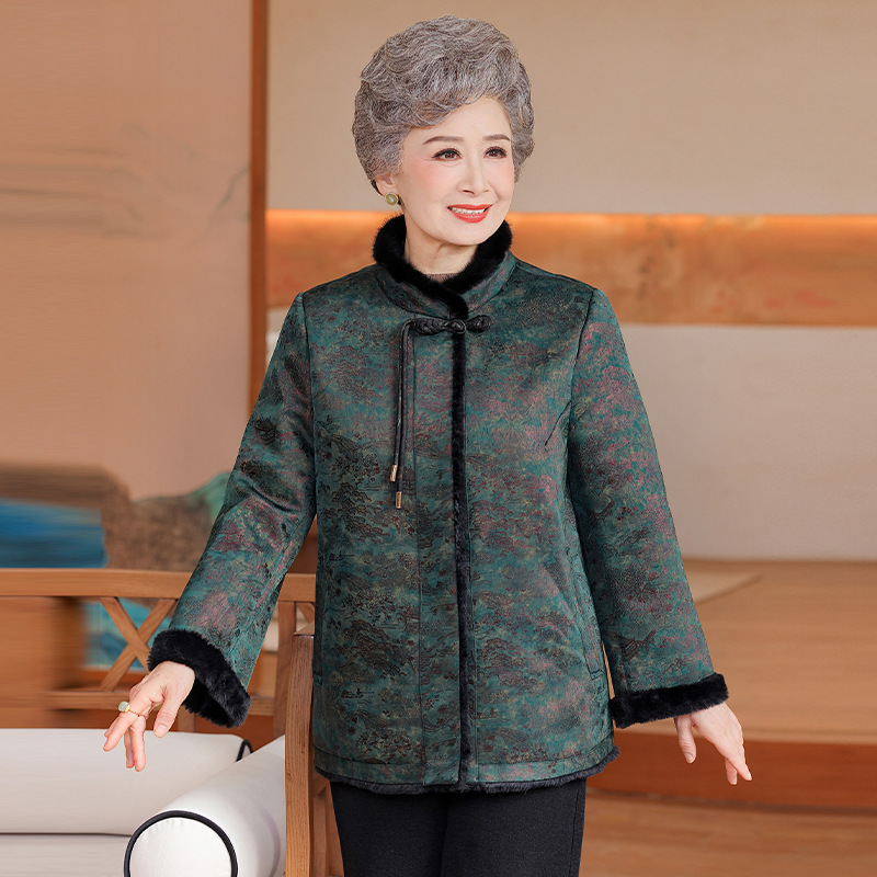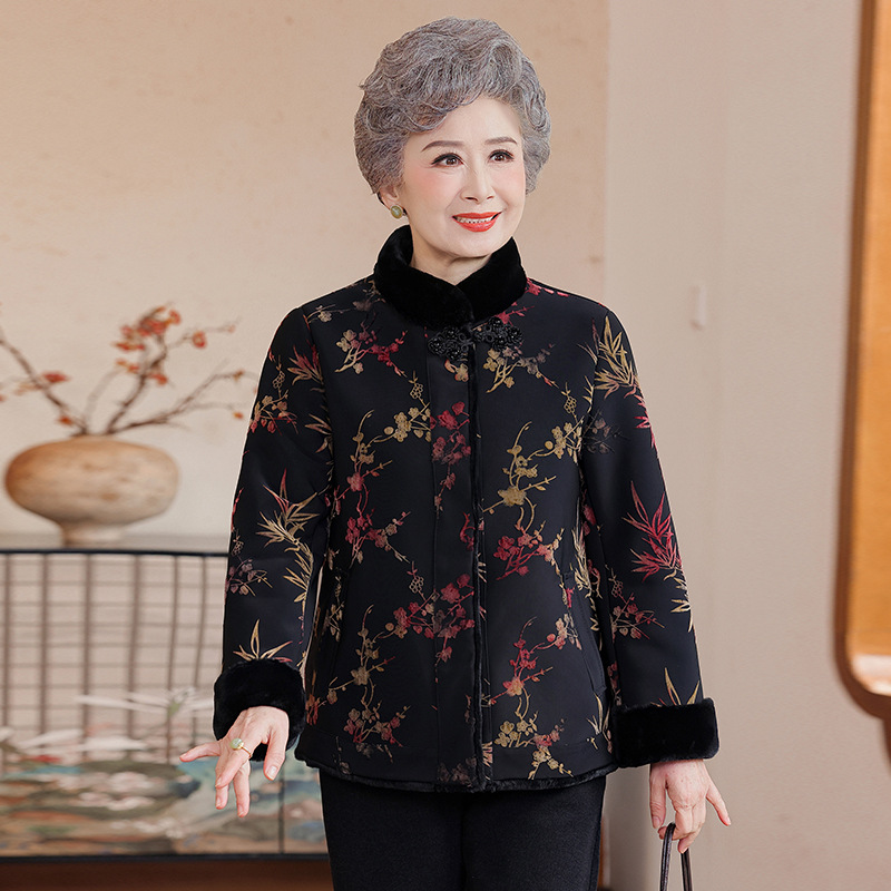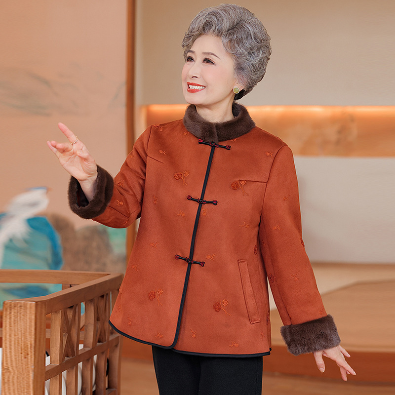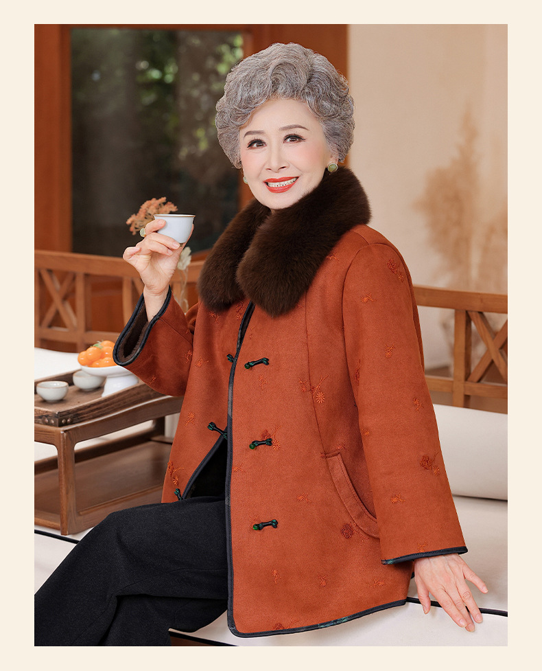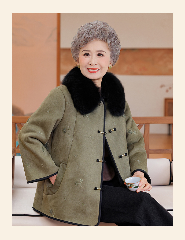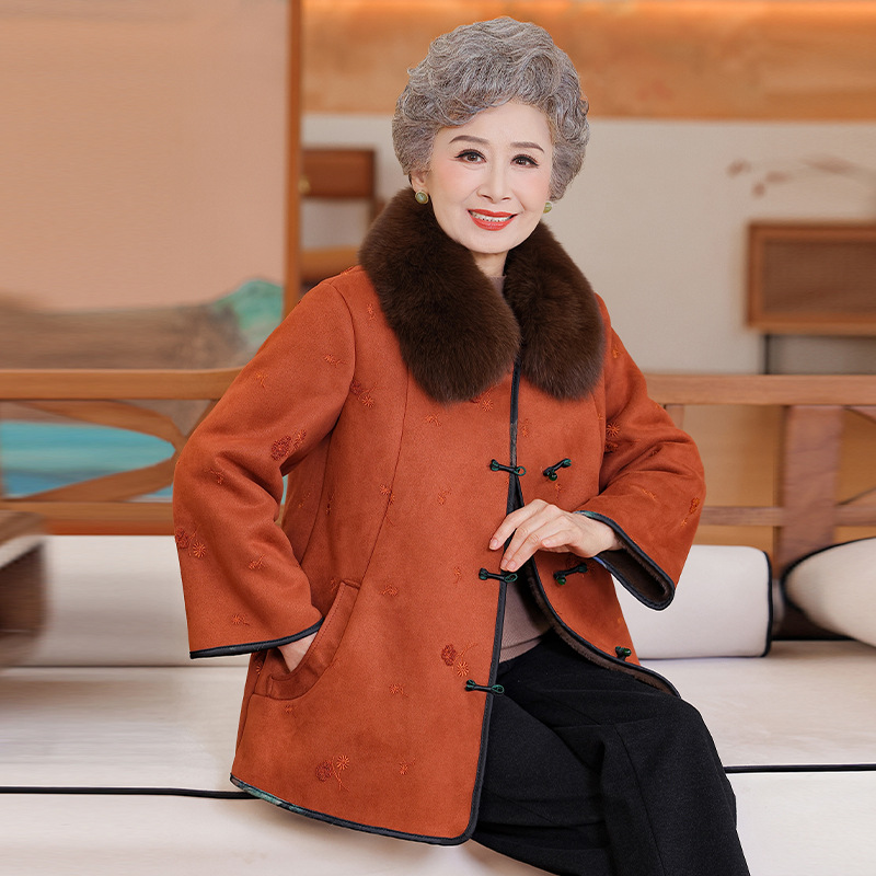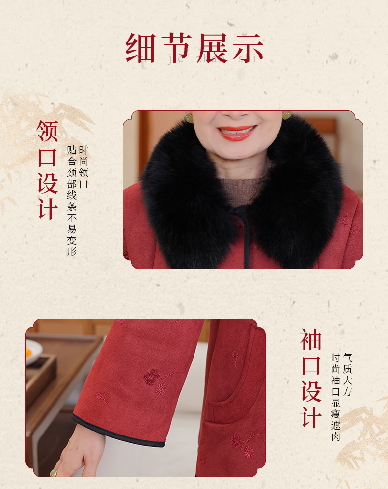 中老年妈妈冬季皮毛一体外套国风大码棉袄女奶奶加绒加厚立领大衣