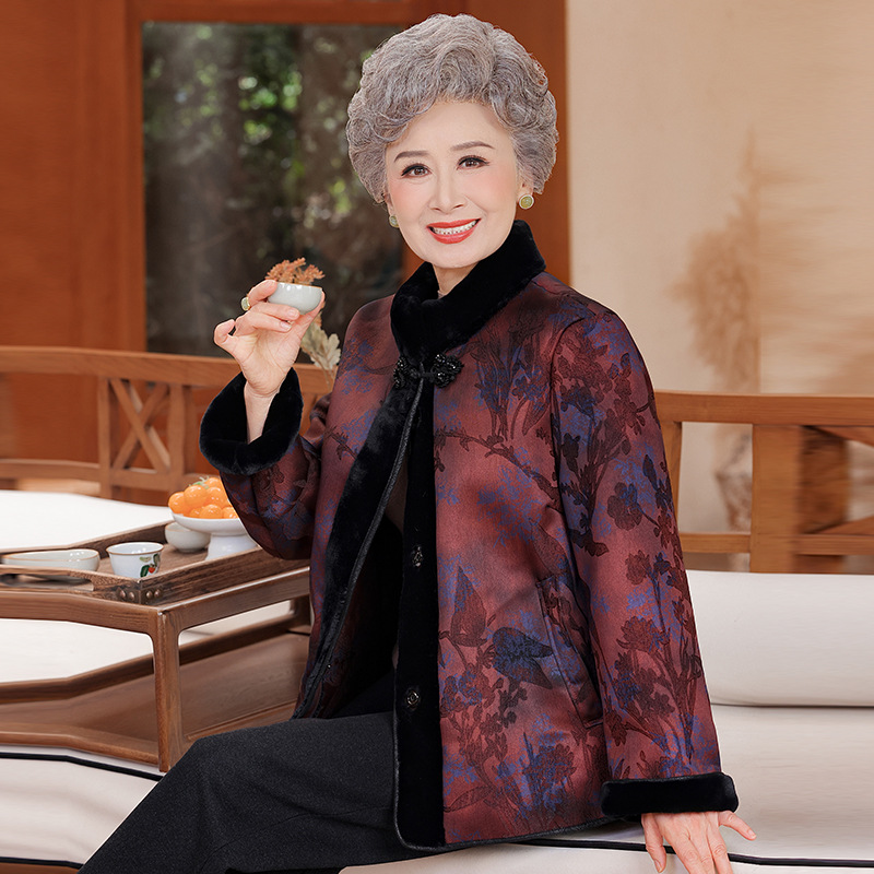 奶奶装冬装加绒加厚外套仿皮貂紫色保暖上衣70岁80多老太冬季衣服