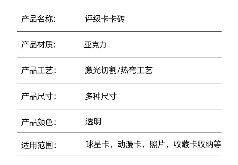 规格 评级卡砖,评级卡砖-直角款,贝壳卡砖,35PT-透明卡砖,55PT-透明卡砖,75PT-透明卡砖,100PT-透明卡砖,130PT-透明卡砖,180PT-透明卡砖
