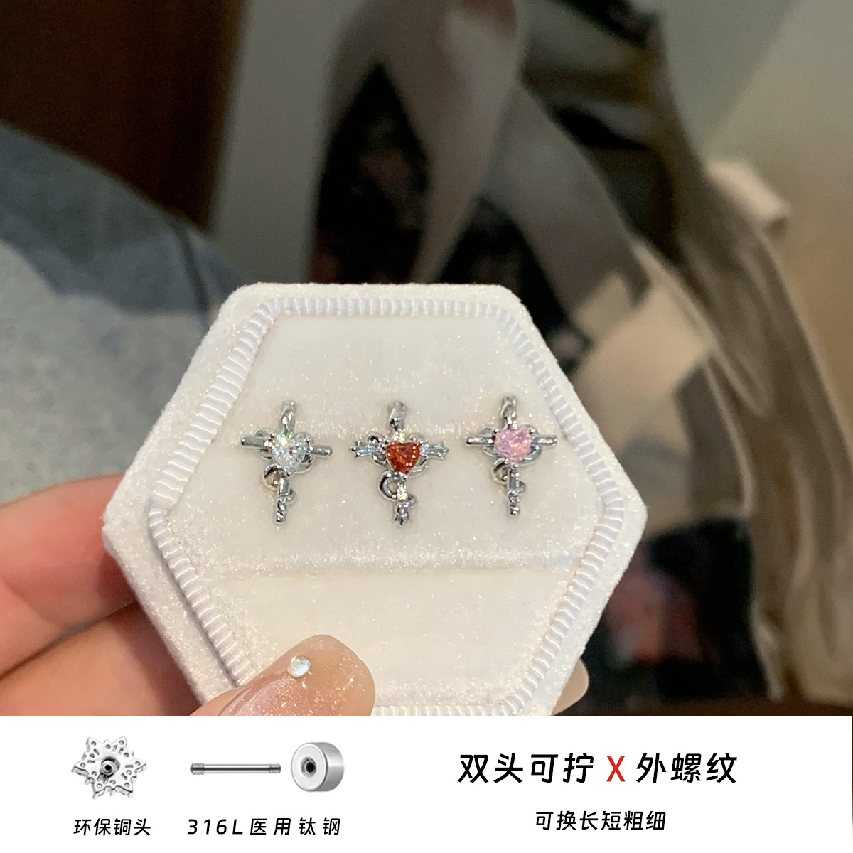 禁忌小蛇缠绕红心十字架复古辣妹耳钉双头可拧316L医用钛钢耳骨钉