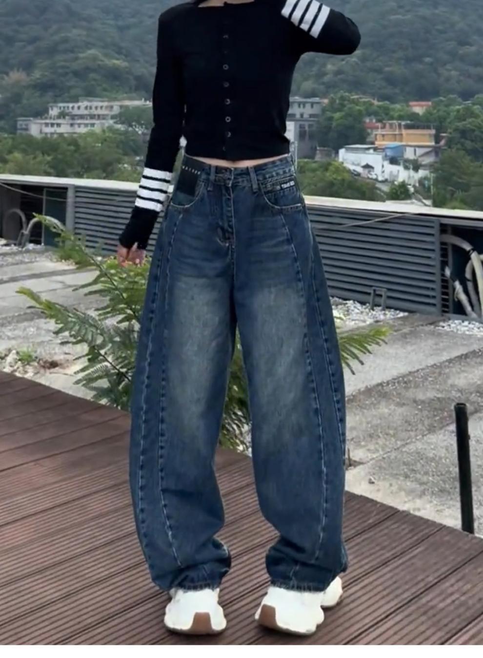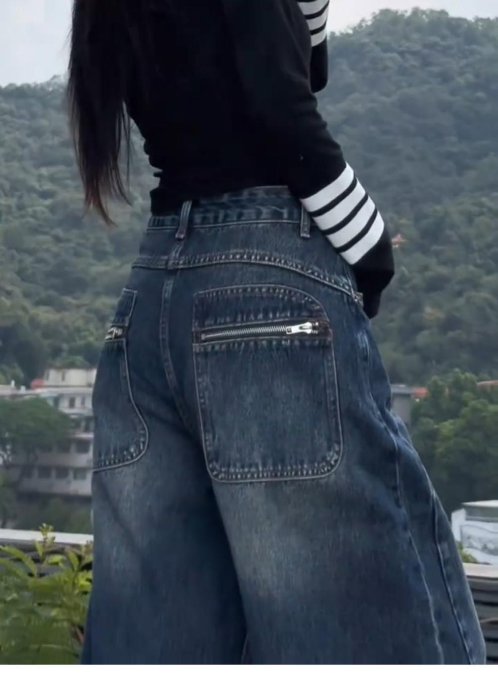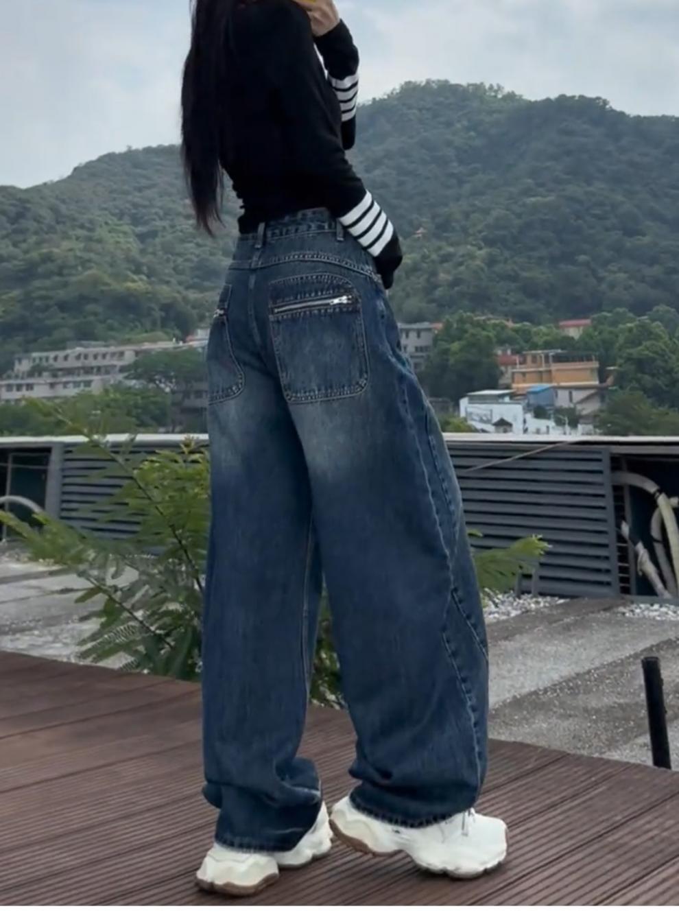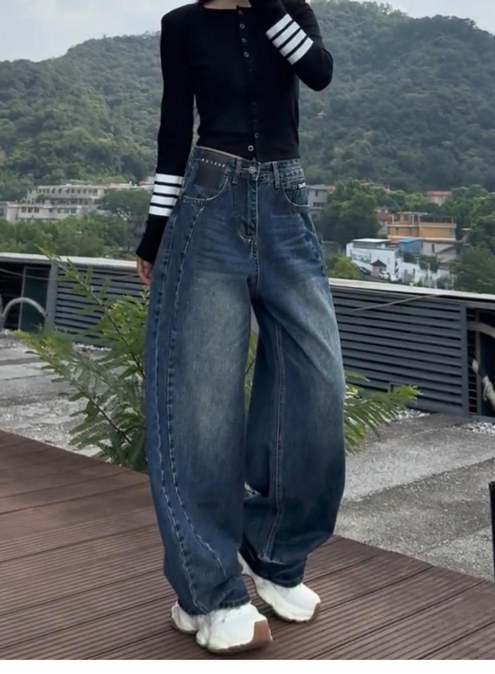 アメリカのレトロな高街のゆるい広脚ジーンズ女性2025春秋の新しいデザイン感の高い腰の垂直感のある曲がり角のズボン