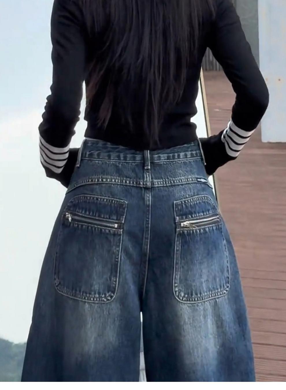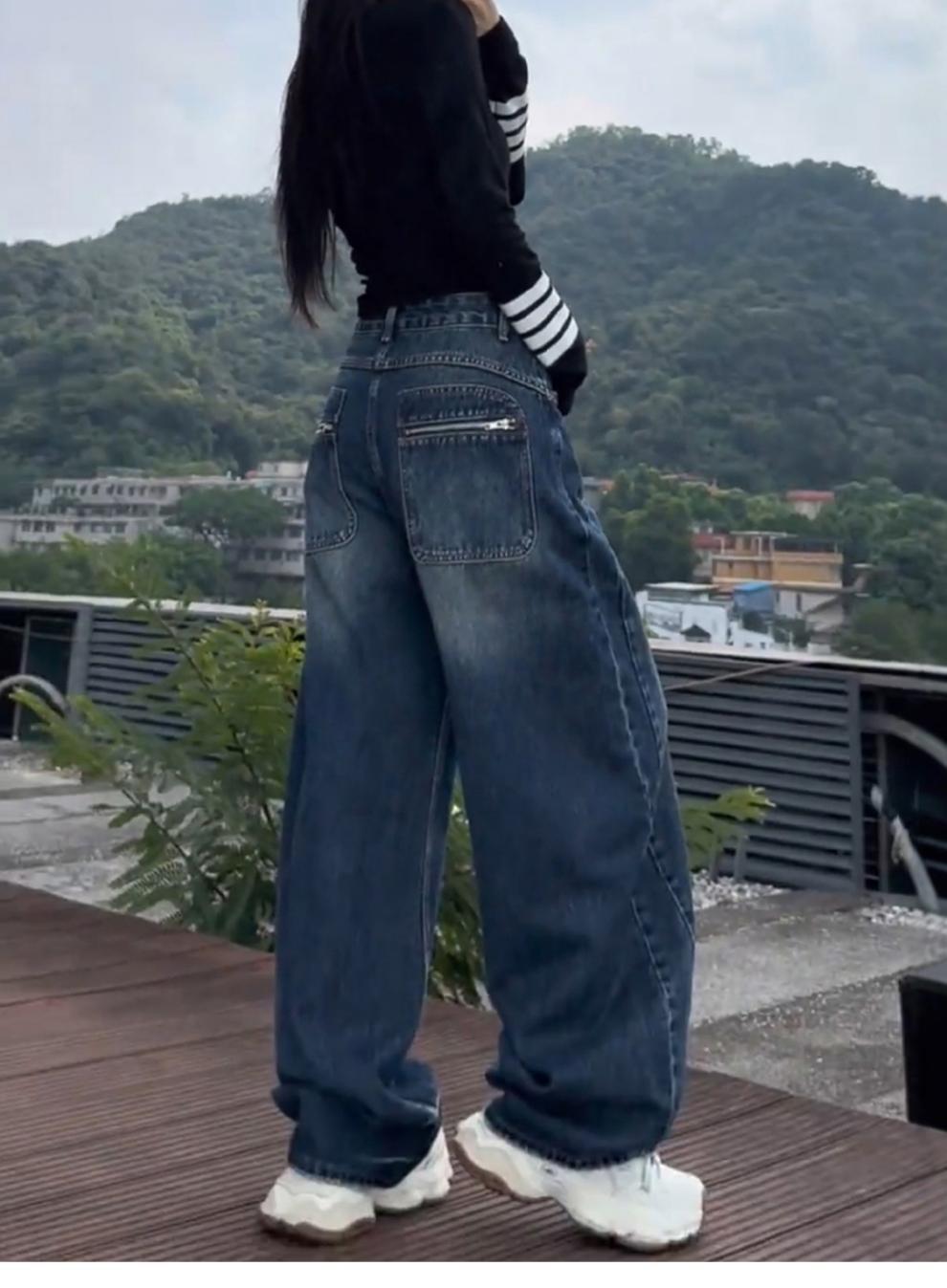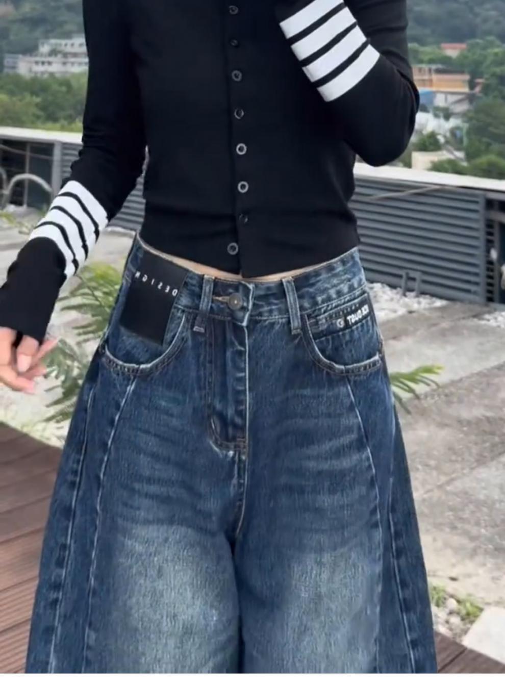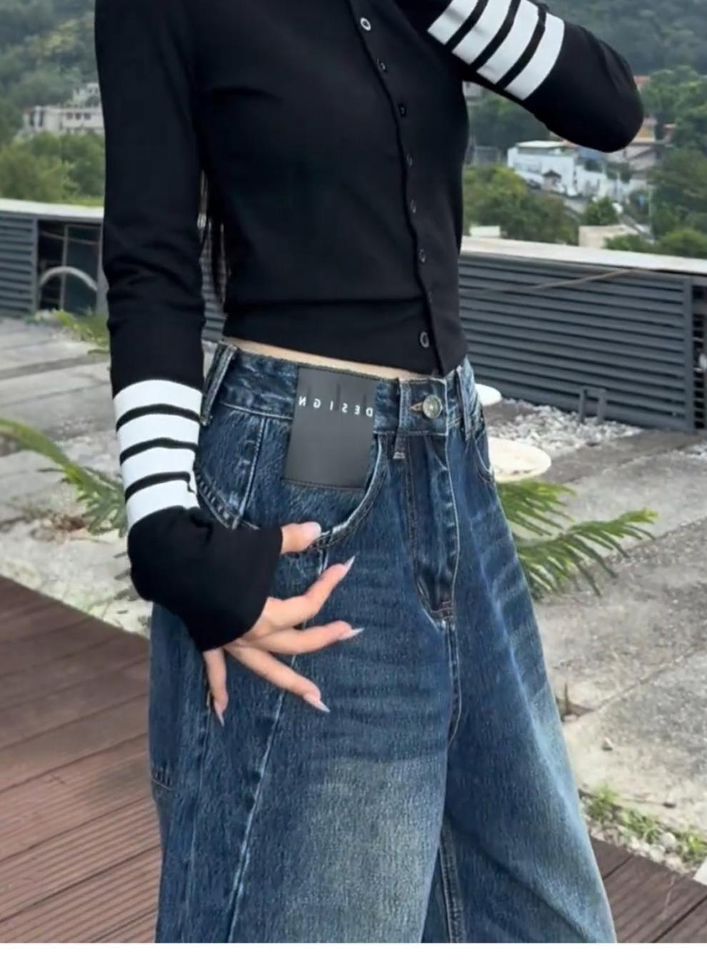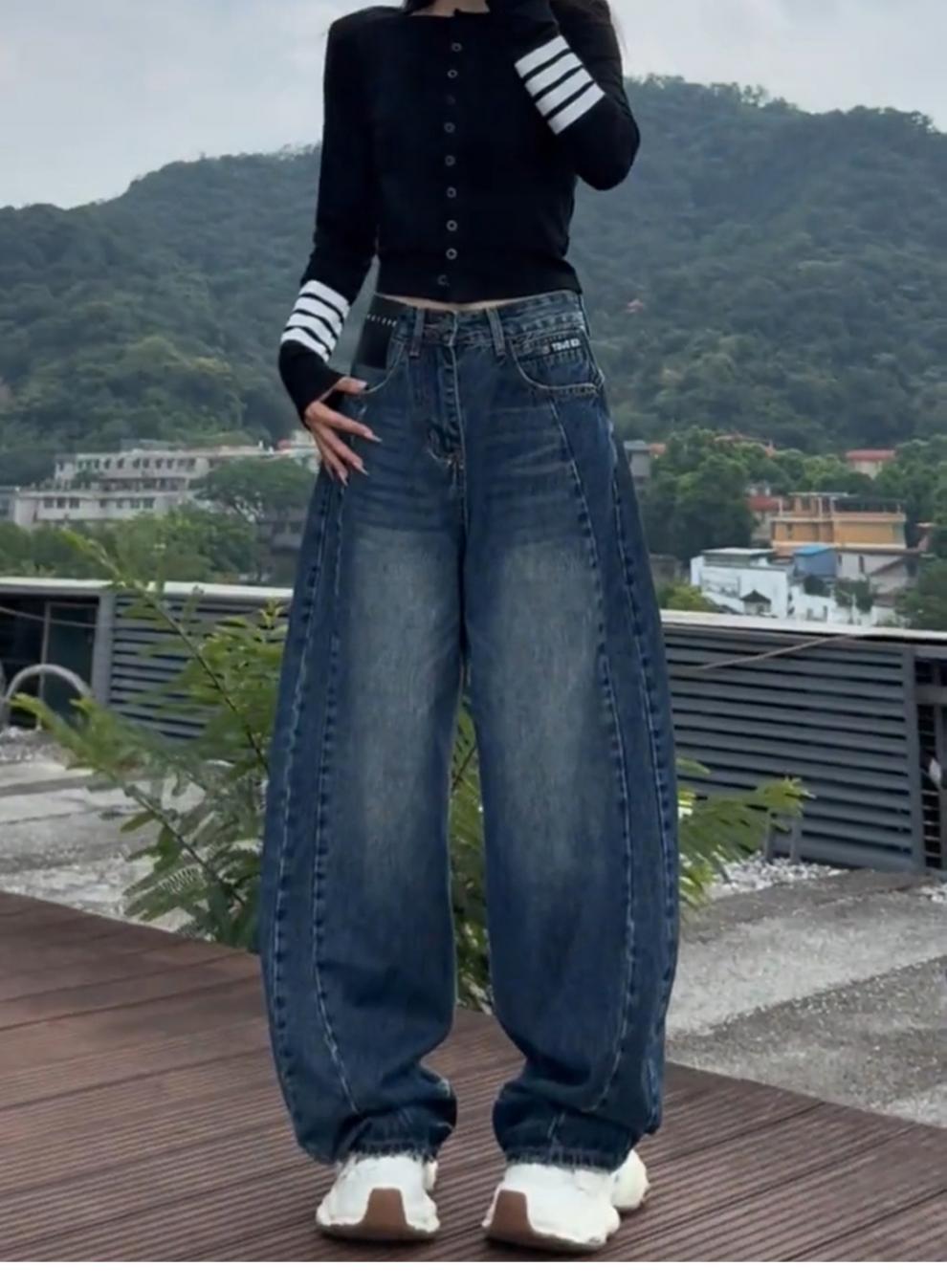 アメリカのレトロな高街のゆるい広脚ジーンズ女性2025春秋の新しいデザイン感の高い腰の垂直感のある曲がり角のズボン