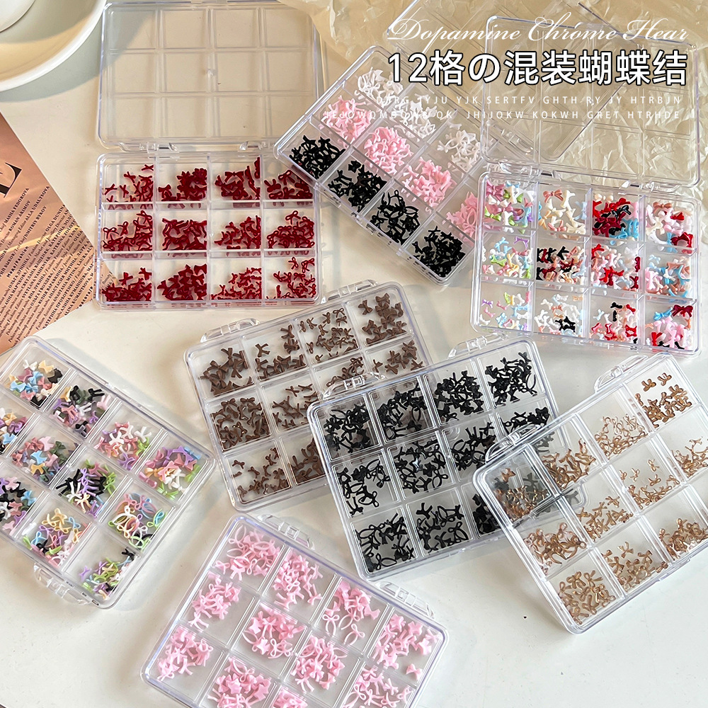 12格卡通蝴蝶结美甲饰品混装秋冬美拉德彩色立体树脂领结指甲装饰