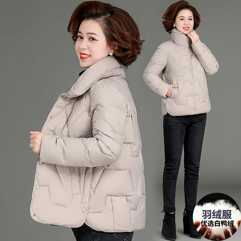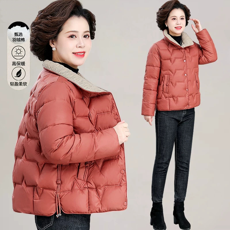 小柄な中年のお母さんの秋冬のコートの中高年の羽毛の綿服の女性の短いタイプの広い奥さんの冬は綿入れの上着を厚くします。