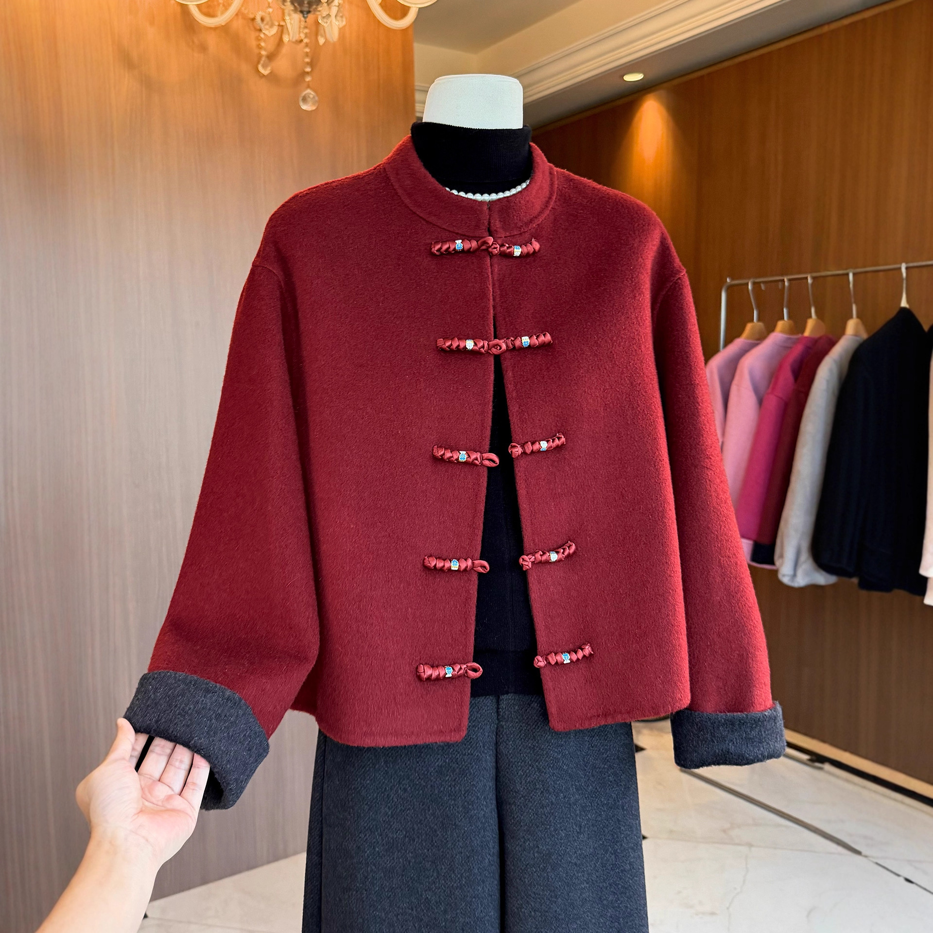 新中式妈妈装毛呢外套冬季喜婆婆国风红色短款呢大衣一件代发