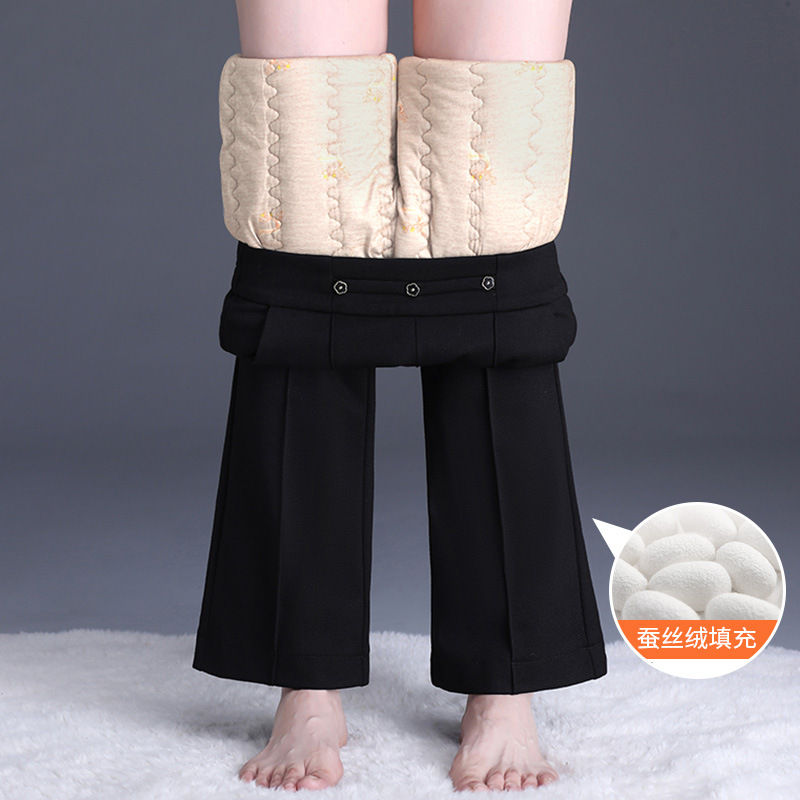 厚い保温シルク綿のマイクロラッパの外は綿のズボンの女性のハイウエストの冬の新型がやせて長いラッパのズボンのファッションを現します。