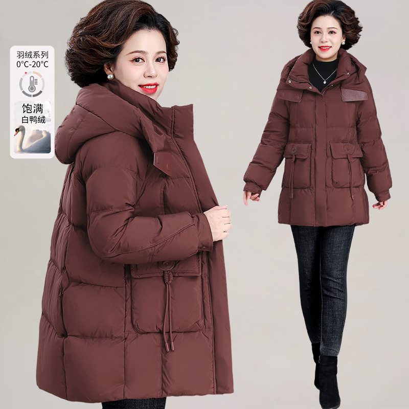 中年のお母さんの冬服のダウンジャケットの中の長さの2024の新型の中高年のコートの女性の秋冬の帽子の厚い綿入れの上着
