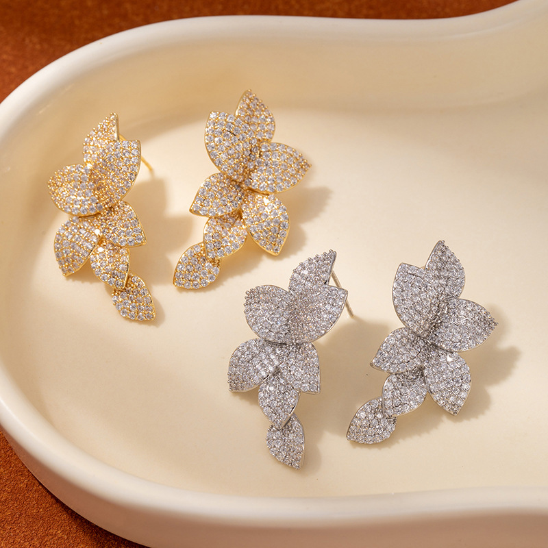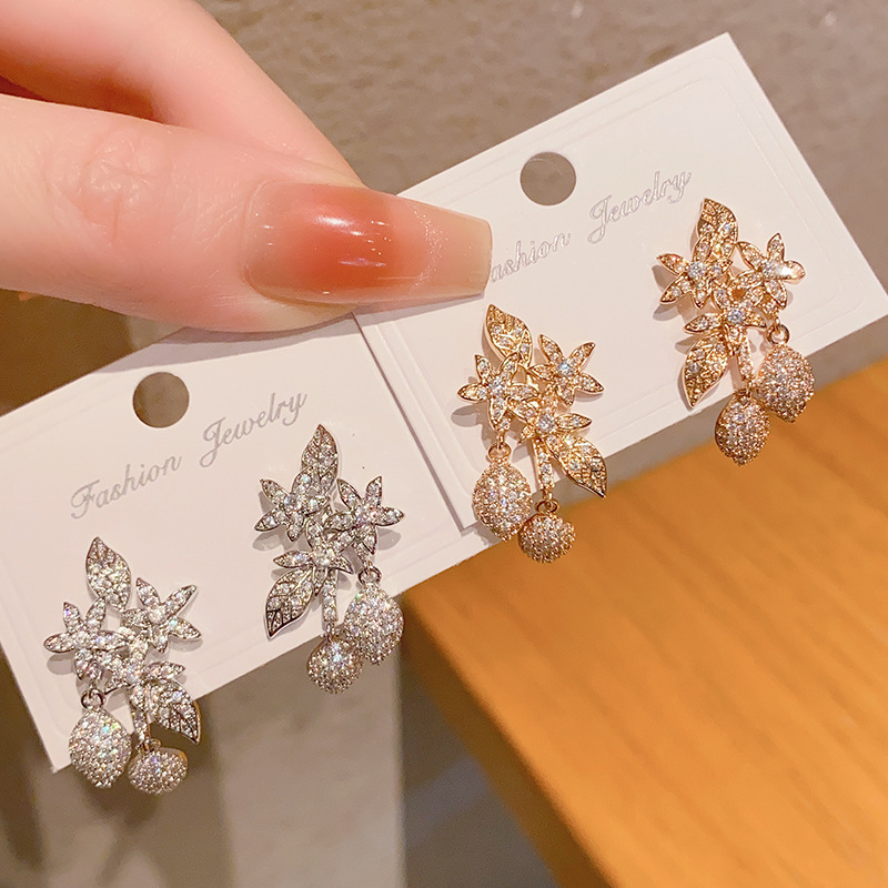 铜镶锆石韩国饰品时尚花朵水滴柠檬树锆石耳环轻奢小众精致耳饰女