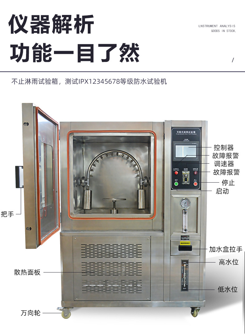 规格 淋雨箱(定制),IPX7浸水试验箱(可定制),IPX34摆管淋雨试验箱,IPX56侧喷淋雨试验箱,IPX8压力浸水箱,IPX9K高压喷水箱