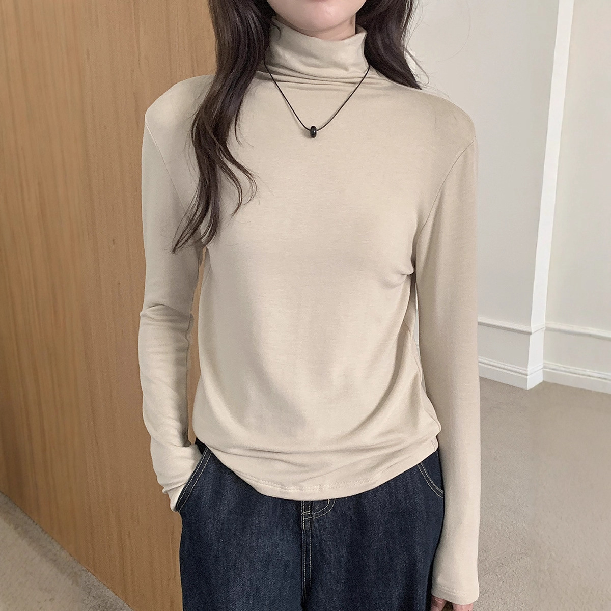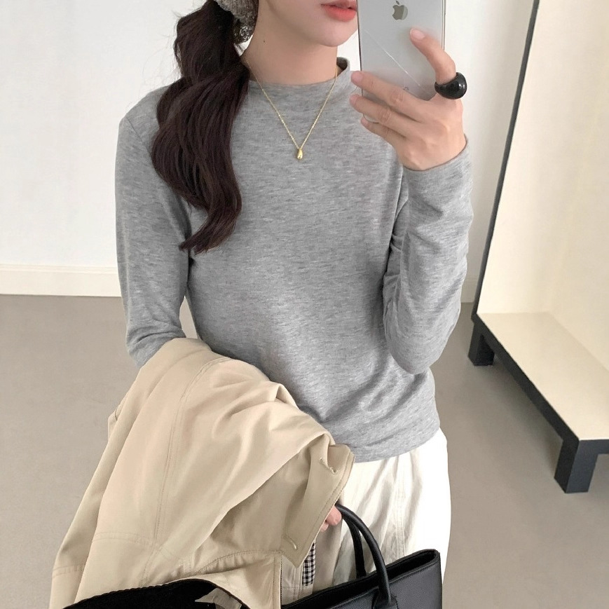 安婷露天丝羊毛中领打底衫女2025秋冬醋酸圆领纯色内搭保暖长袖
