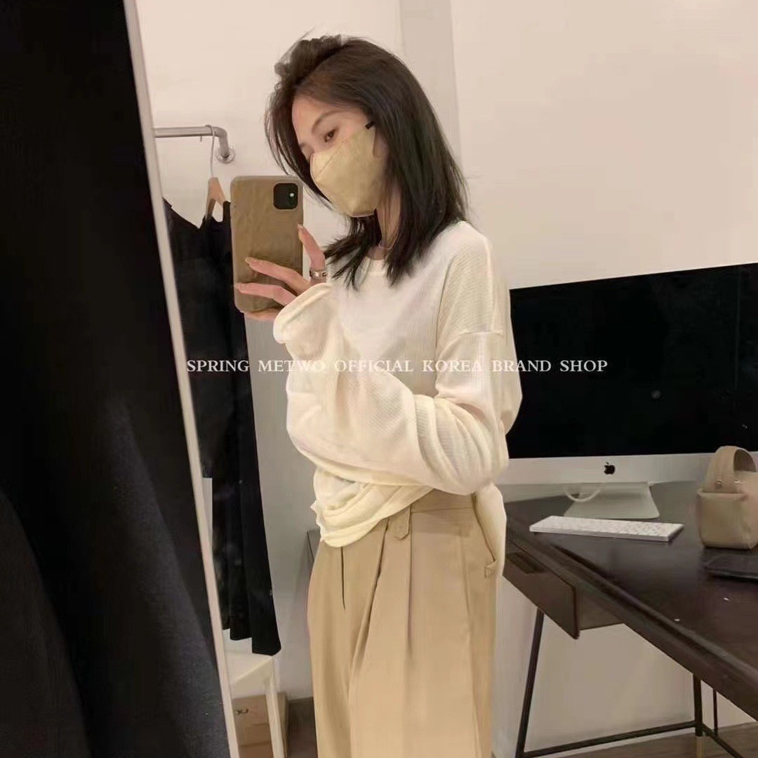 安婷露純色vネック長袖の底のシャツはスリムに見えます。