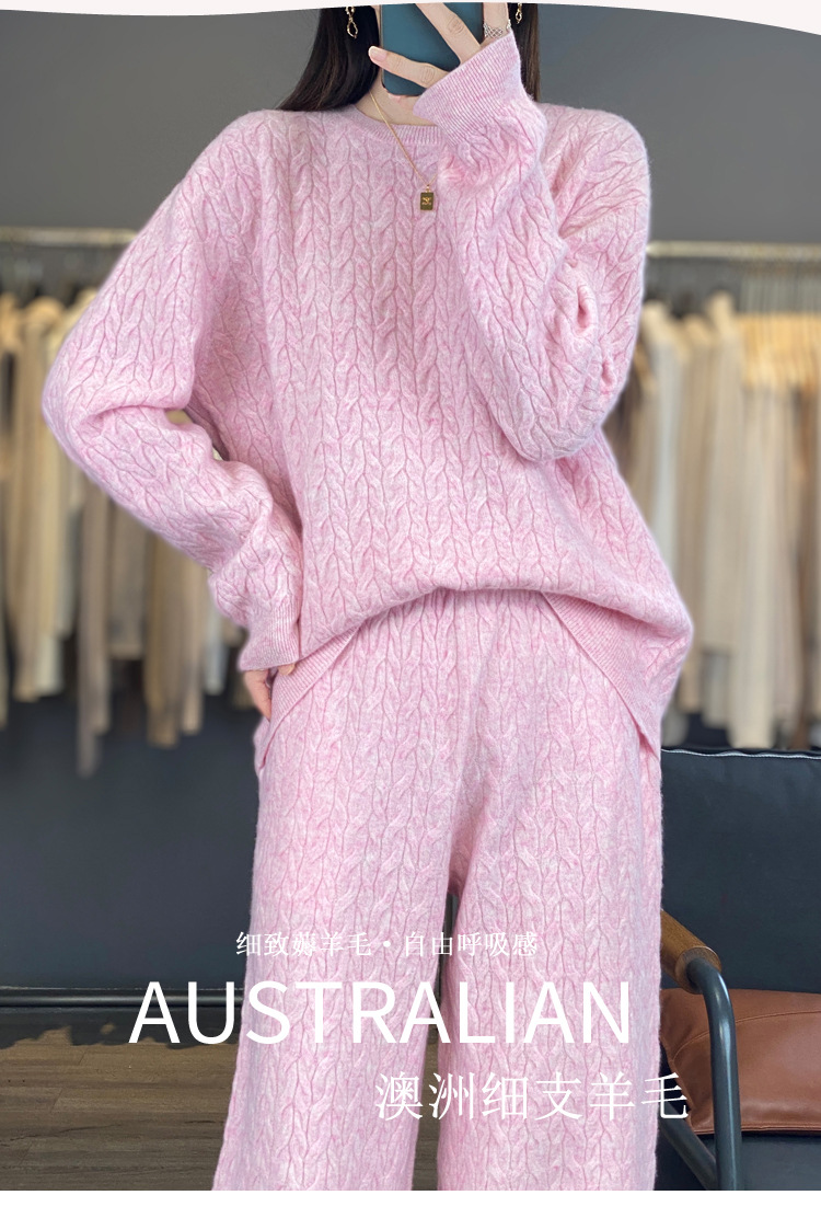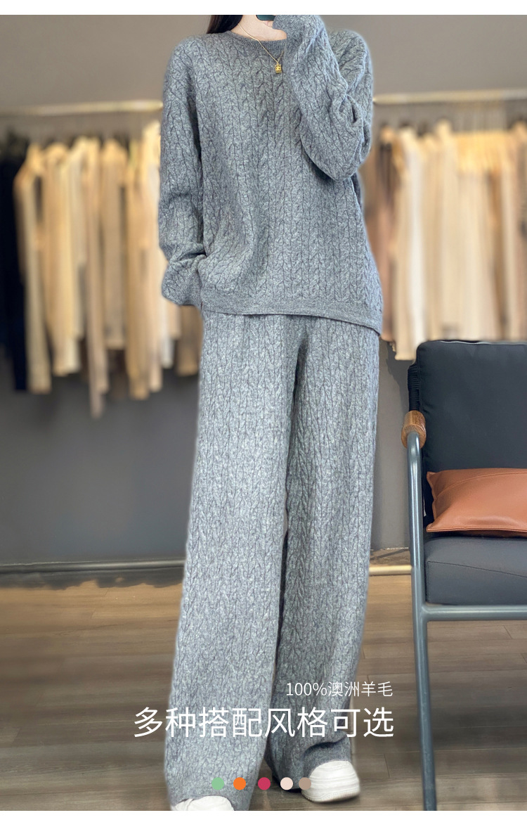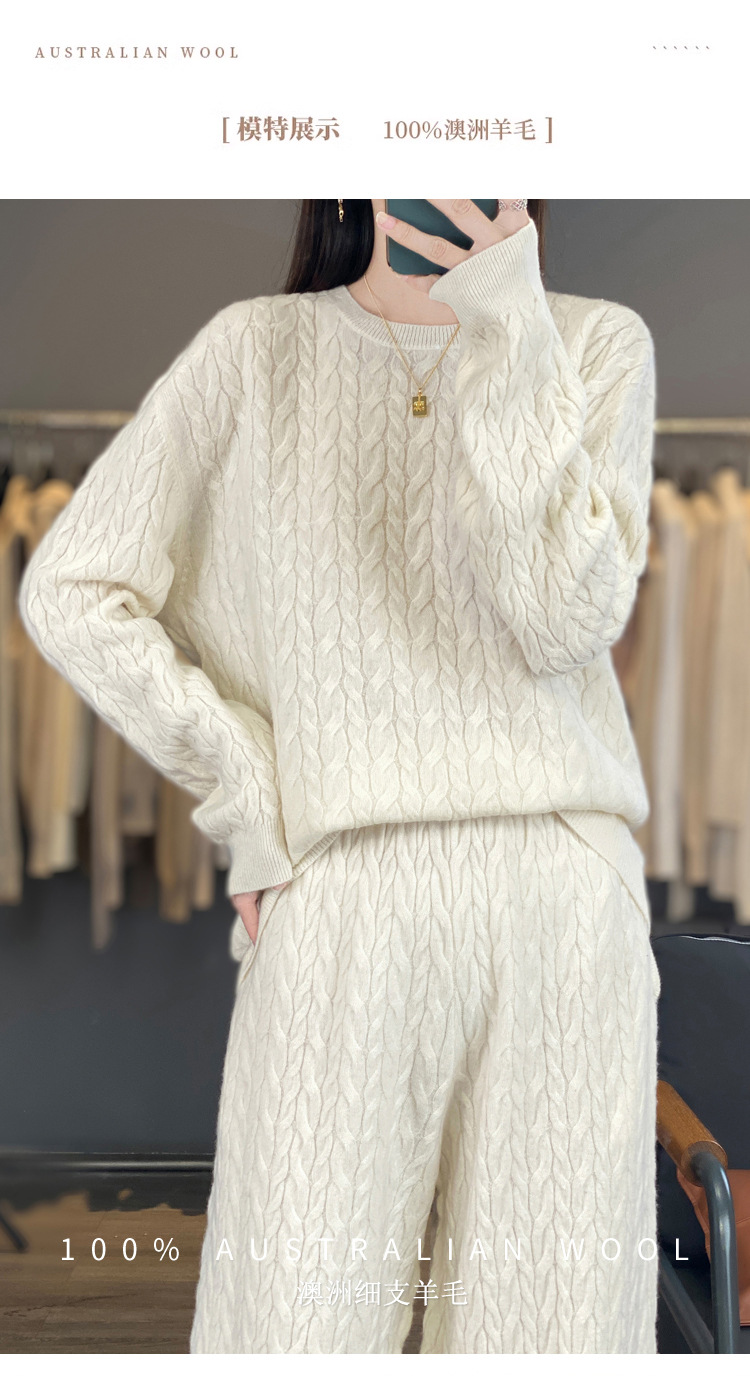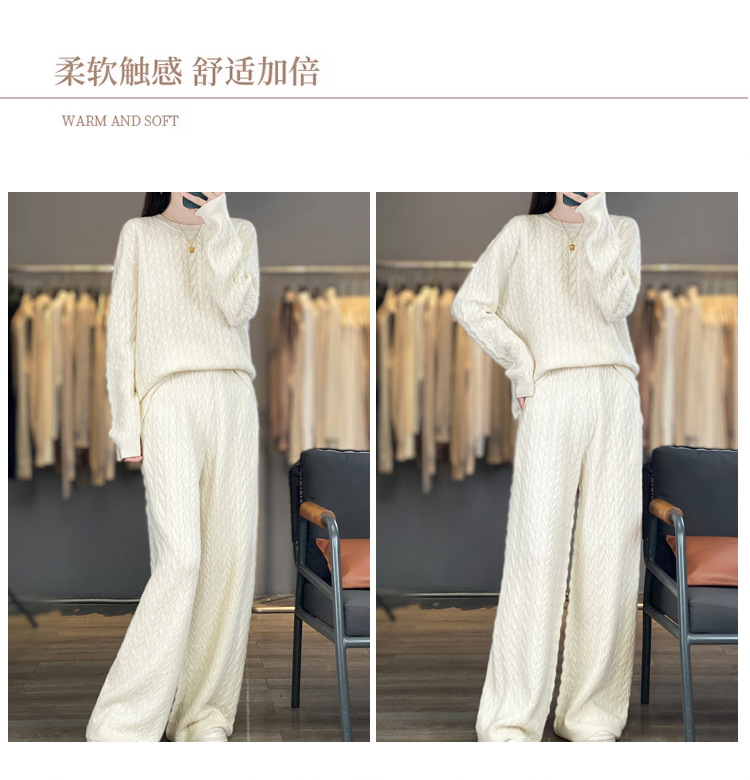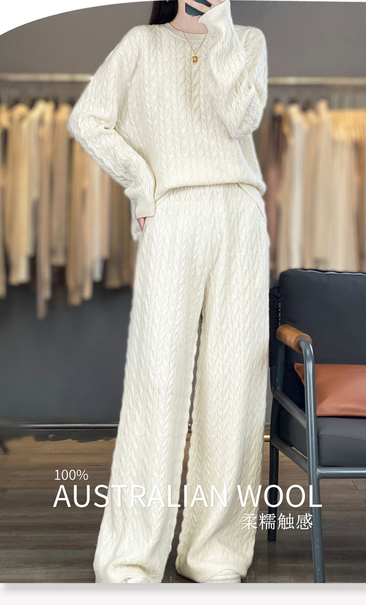 2025年秋冬新款纯羊毛圆领针织衫长袖女绞花纯色阔腿长裤两件套