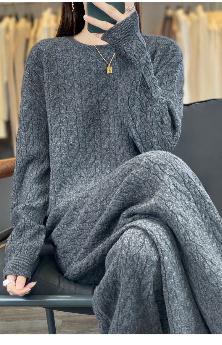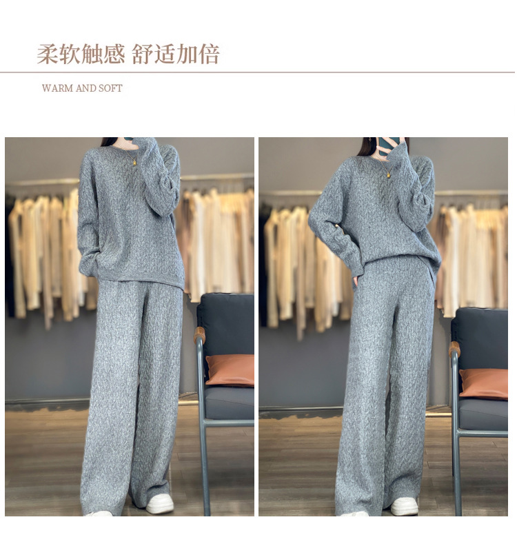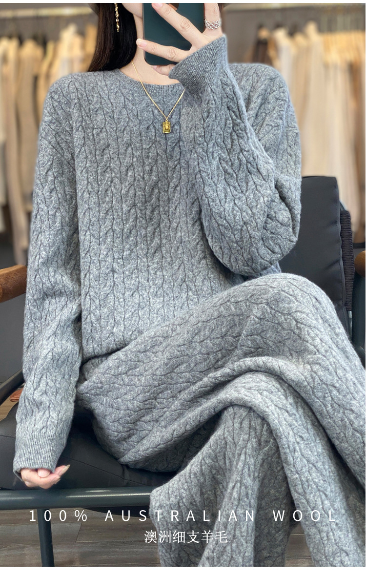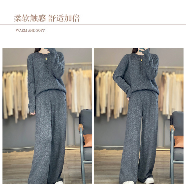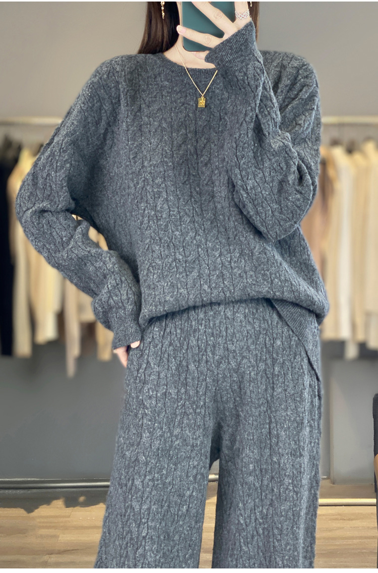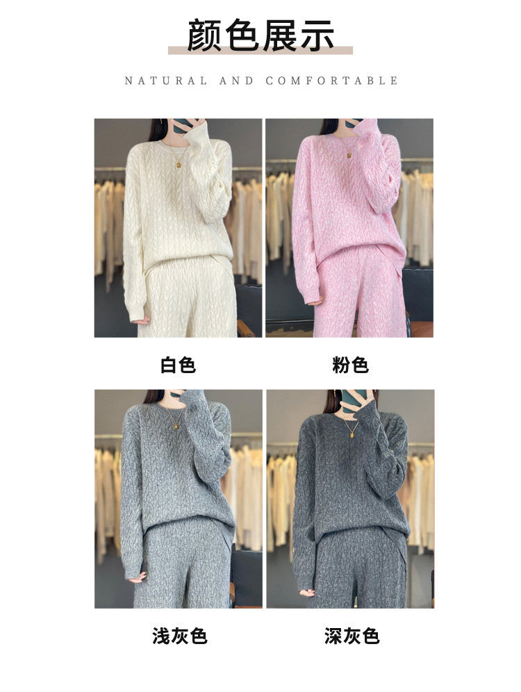2025年秋冬新款纯羊毛圆领针织衫长袖女绞花纯色阔腿长裤两件套
