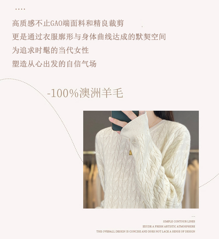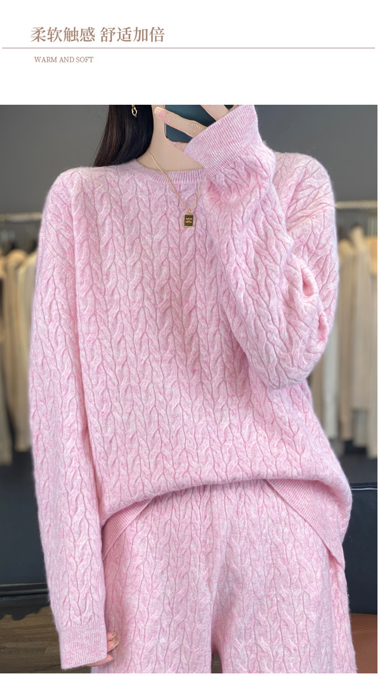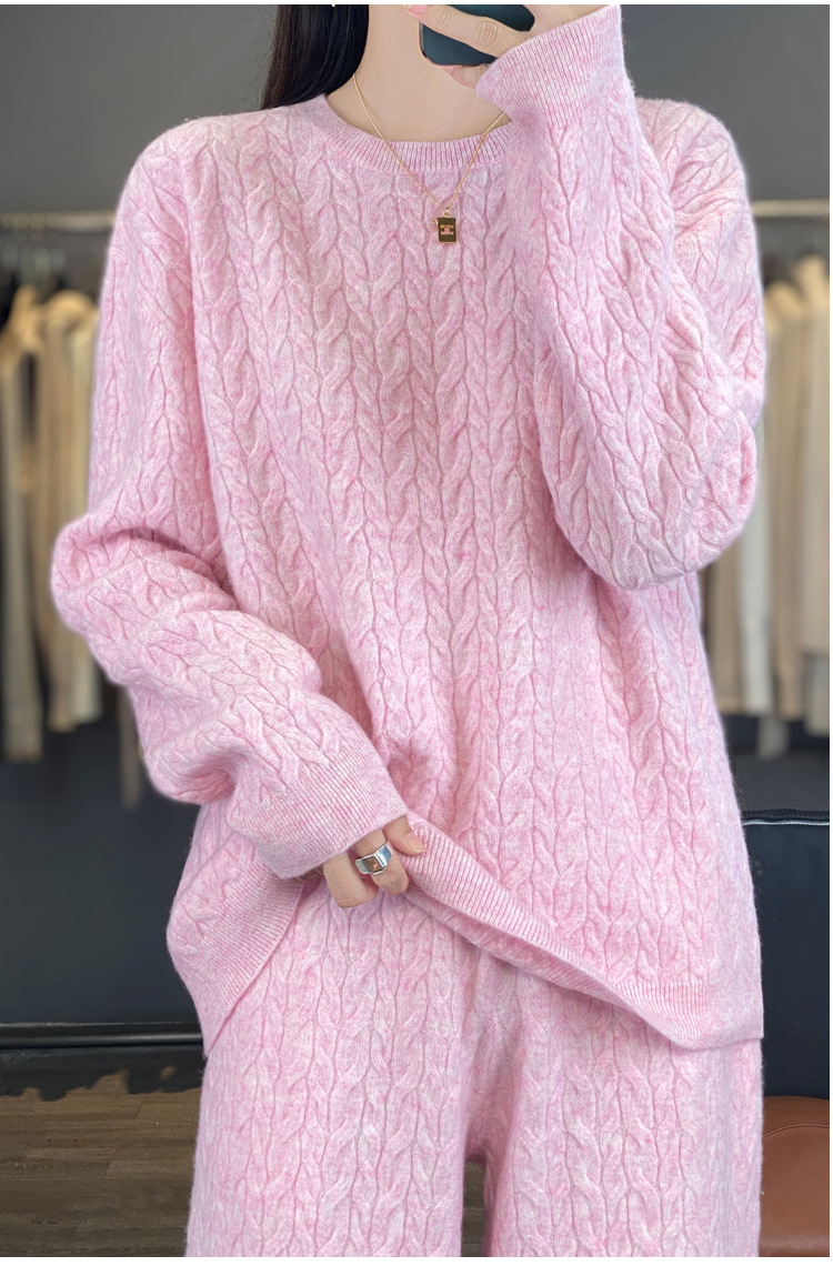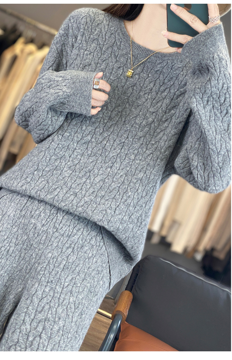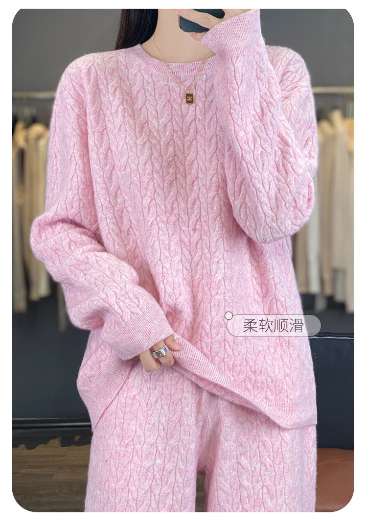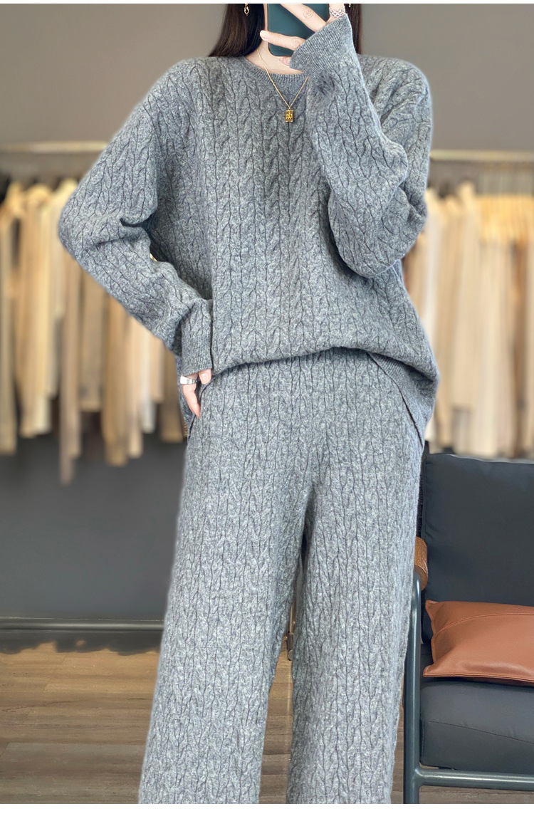 2025年秋冬新款纯羊毛圆领针织衫长袖女绞花纯色阔腿长裤两件套