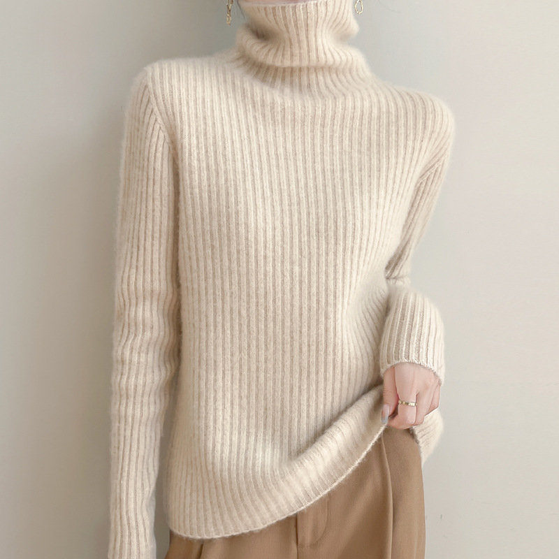 2025秋冬新作高級既製服ハイネックピュアウールニットセーター、ストライプ柄無地ゆったりプルオーバーインナーウェア