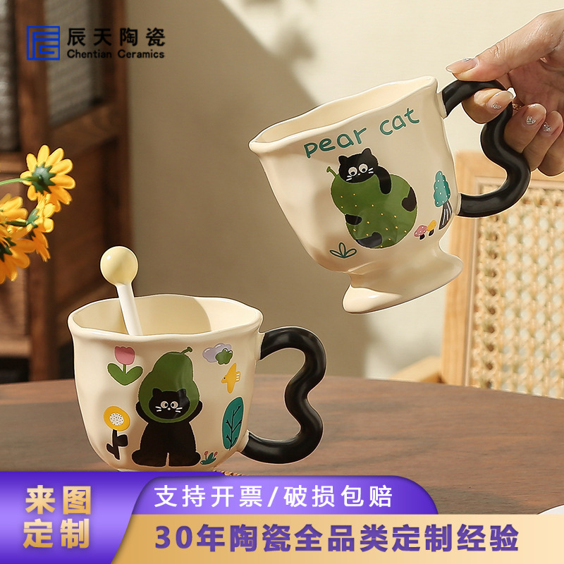 復古風萌え趣味陶磁器ニャンニャンニャン頭カバー異形マグカップ蝶折れ線弧度スプーンクリーム付きお茶カップ