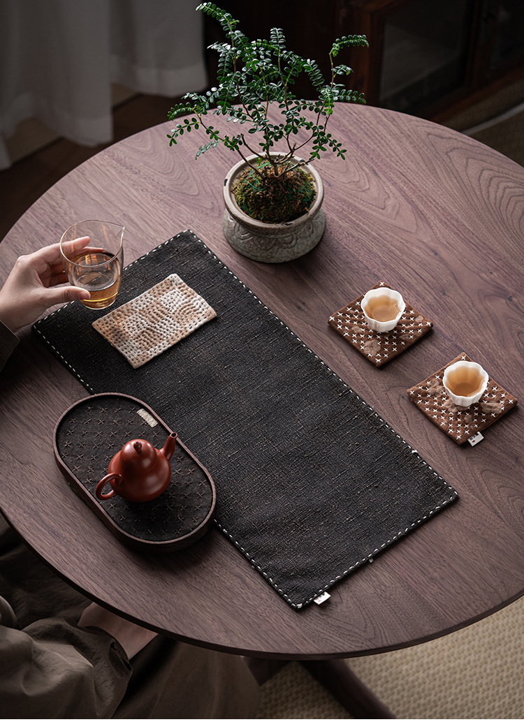 粗纹柿染黑色茶席老布手工植物染茶桌隔热垫子桌旗家用流苏干泡席