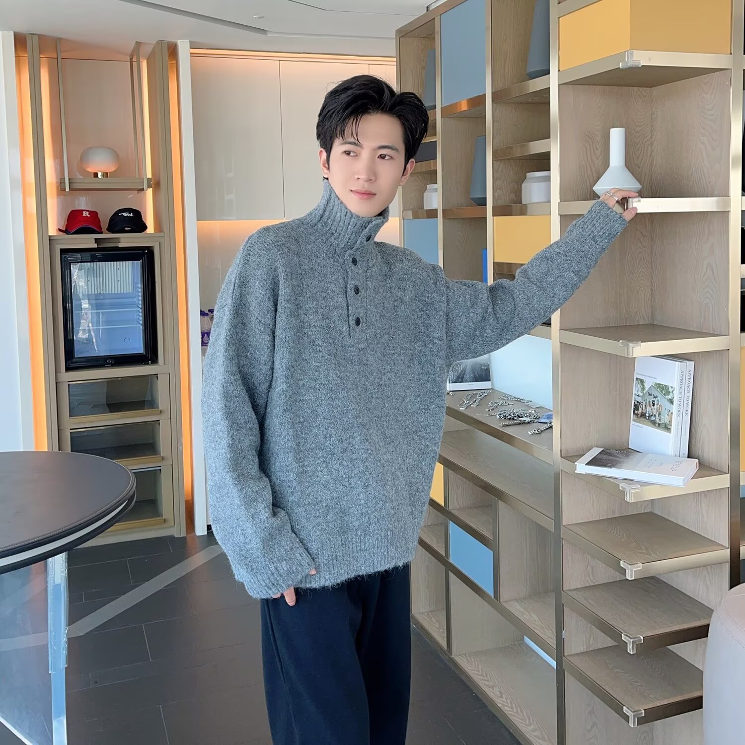 2026年韓国版トレンドブランドハーフタートルネックニットセーター、メンズゆったり春秋高級感ルーズフィットセーターコート