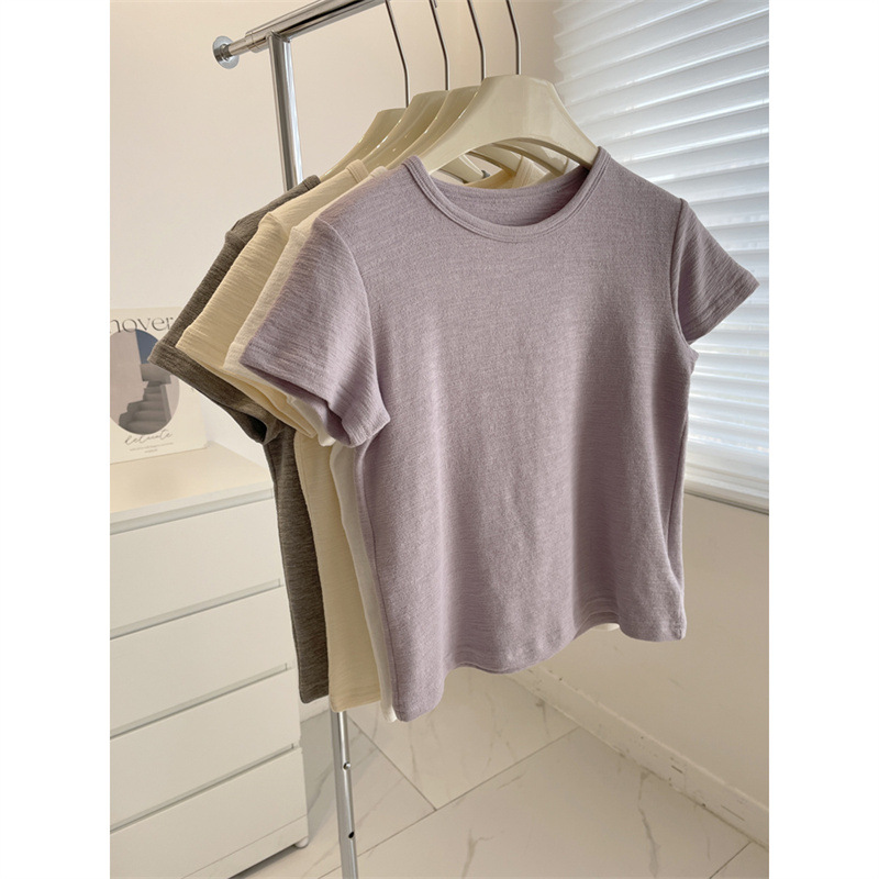 質感〜女性用ショートスリーブTシャツ!夏万能無地着痩せショートラウンドネックショルダートップTシャツ