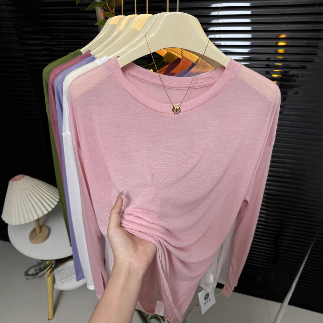 夏の新しい通気性のあるチュール長袖日焼け止めブラウス、ファッショナブルでルーズ、スリムで多用途、女性用の怠惰なスタイルの無地のTシャツ