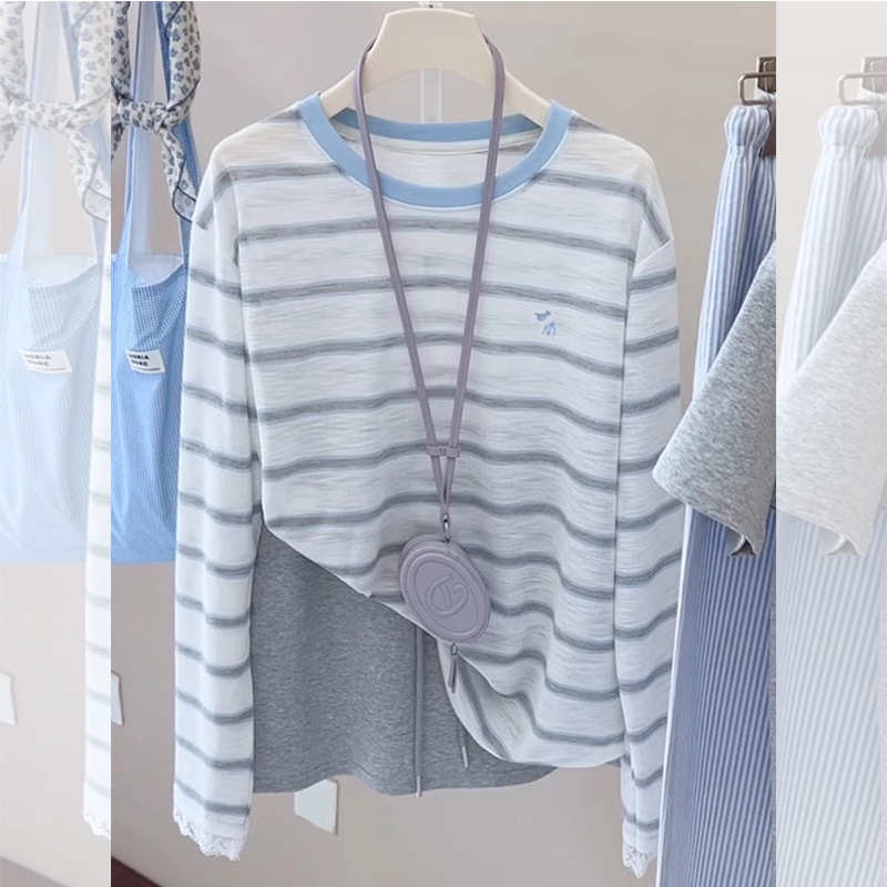 韓国ブルーストライプ日焼け止め長袖 Tシャツ女性のための 2025 夏の新しいルーズ空調ブラウス薄手のトップ
