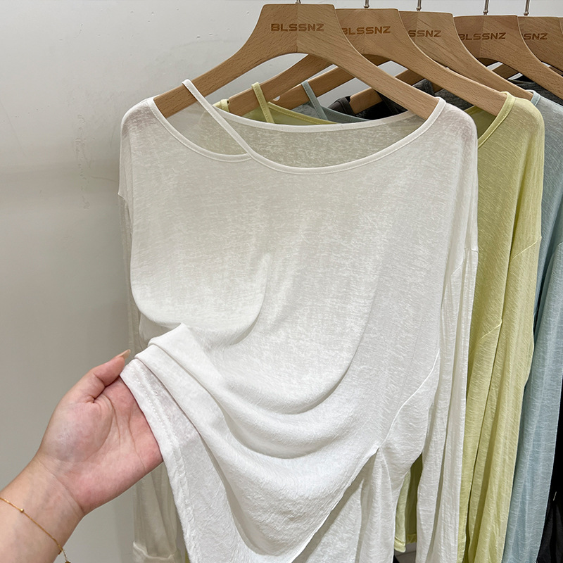女性用の白い大きなUネック日焼け止めブラウス、アイスシルクの薄い夏のデザインニッチオフショルダースプリットTシャツ長袖トップ