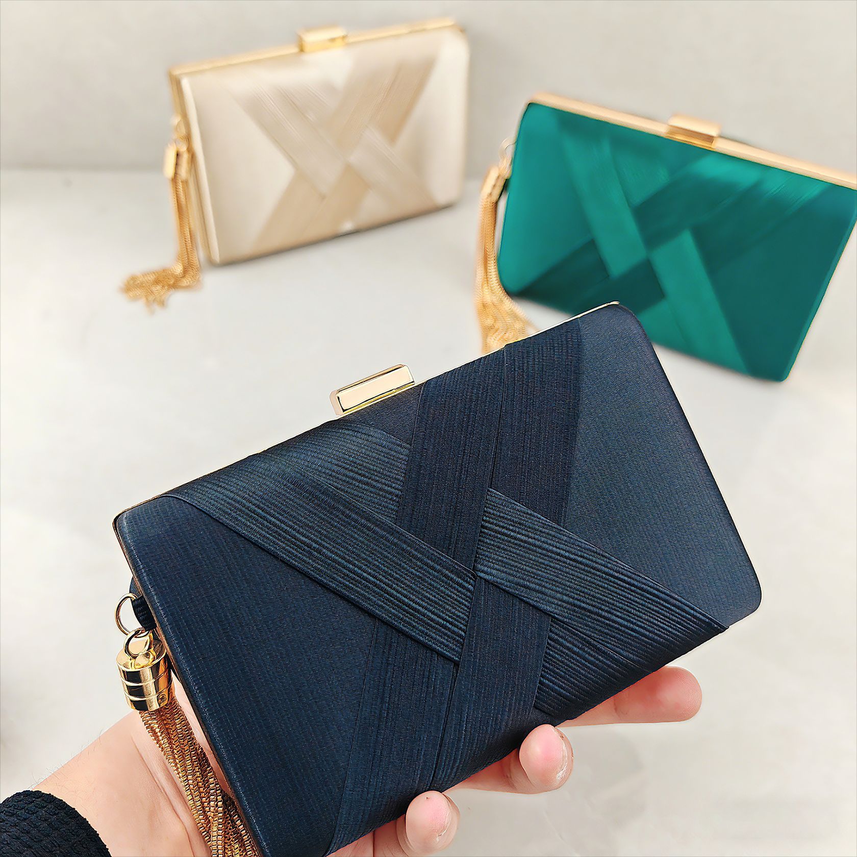 新款缎面编织流苏晚宴包欧美女士时尚手拿包搭配礼服晚装包女包包