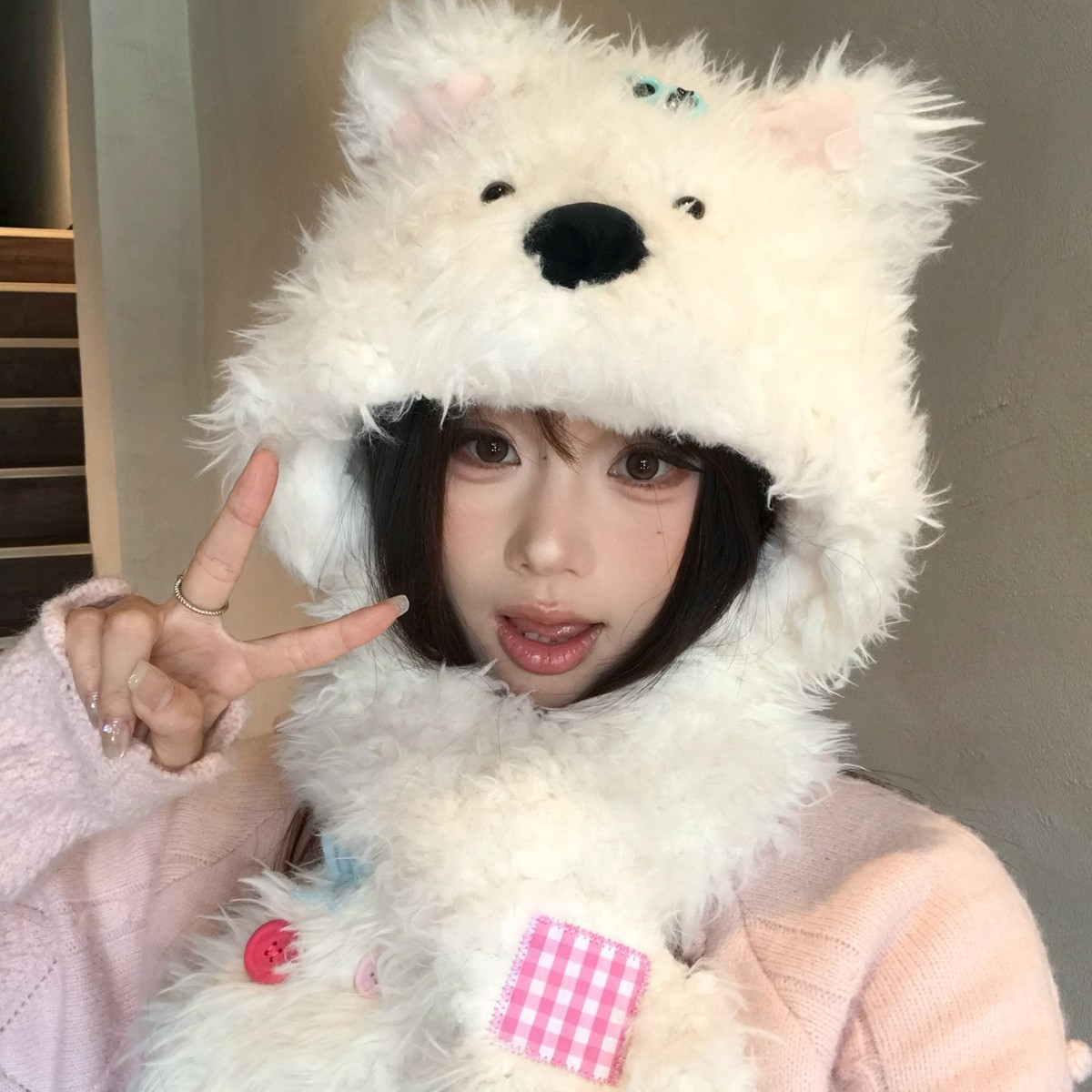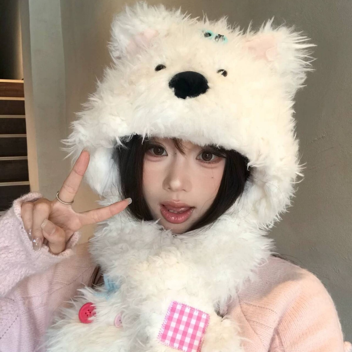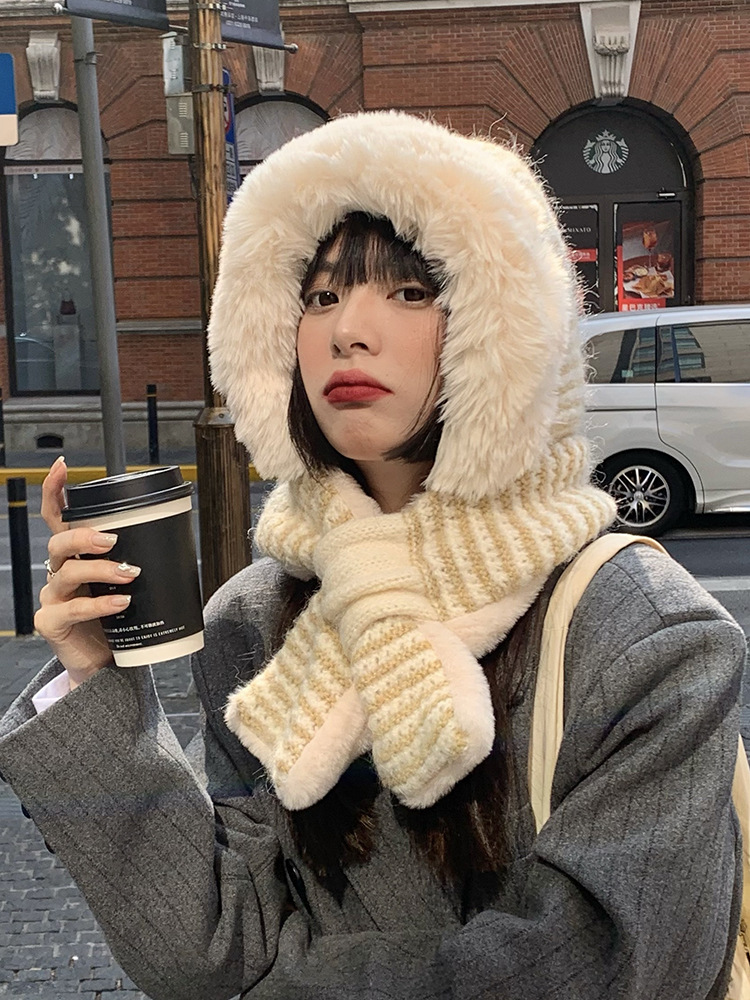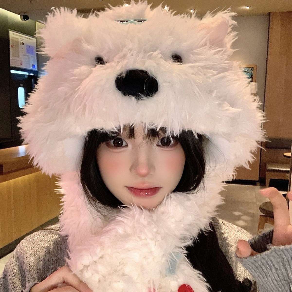 白色可爱小狗毛绒帽子围巾一体女冬季保暖防寒帽围脖两件套雷锋帽