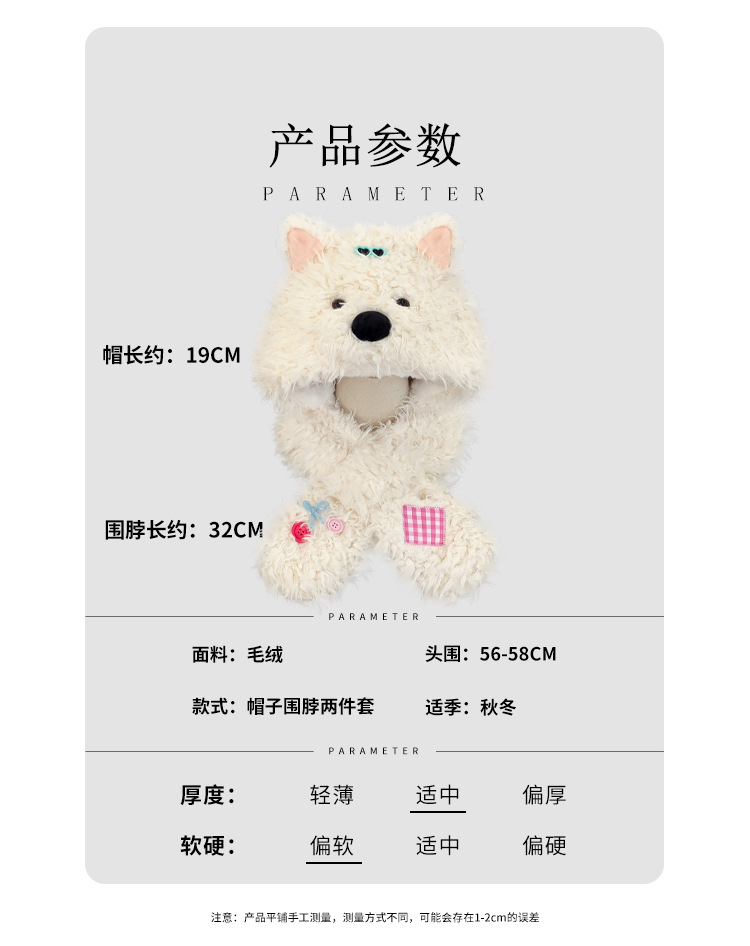 可爱西高地小狗毛绒帽子围脖一体两件套冬季加厚保暖护耳帽雷锋帽