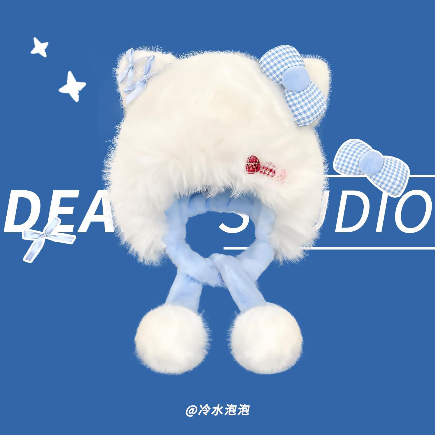 日系可爱蝴蝶结猫咪耳朵毛绒帽女秋冬季加绒保暖防寒护耳雷锋帽子