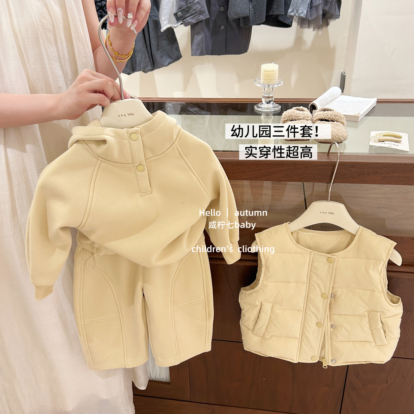 【咸柠七】女童套装秋冬款儿童韩版夹棉马甲连帽加绒卫衣卫裤套装