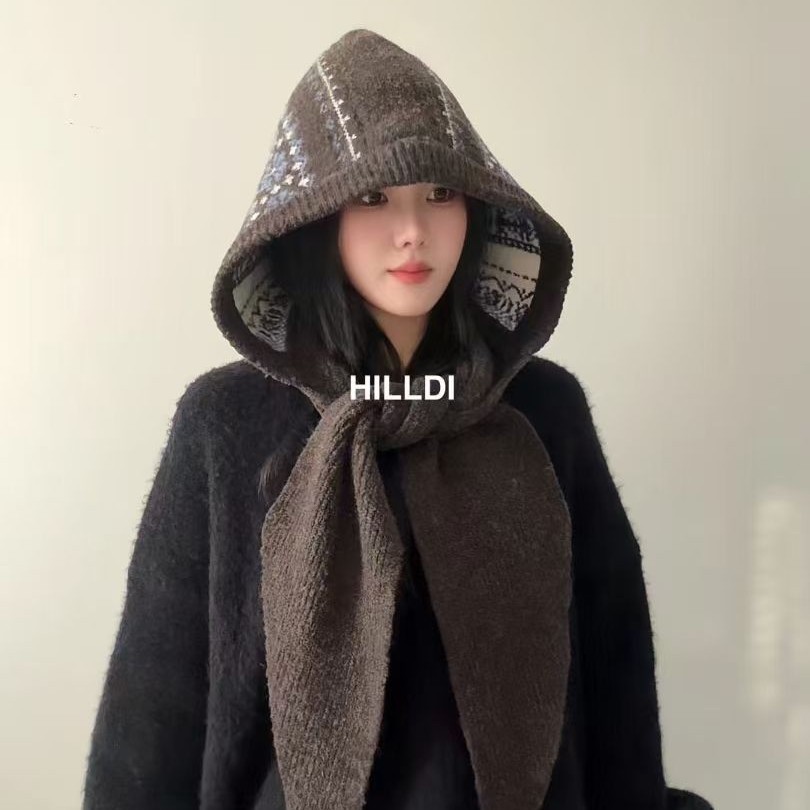 大头围费尔岛法帽子女秋冬保暖护耳针织帽子围巾一体毛线帽显脸小