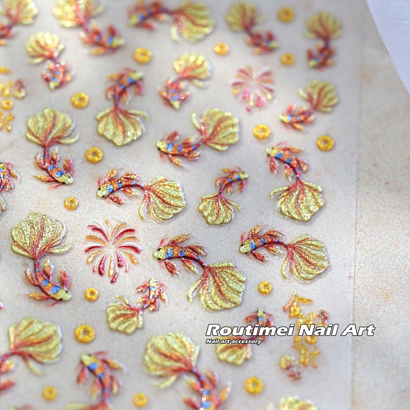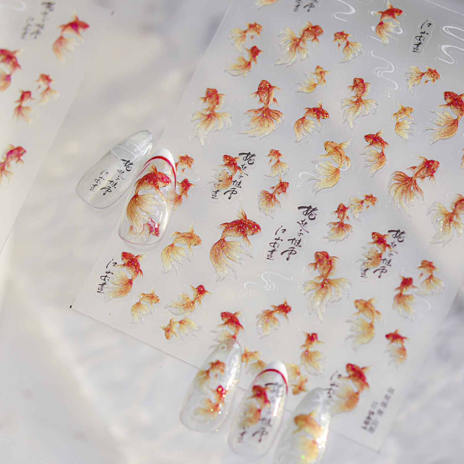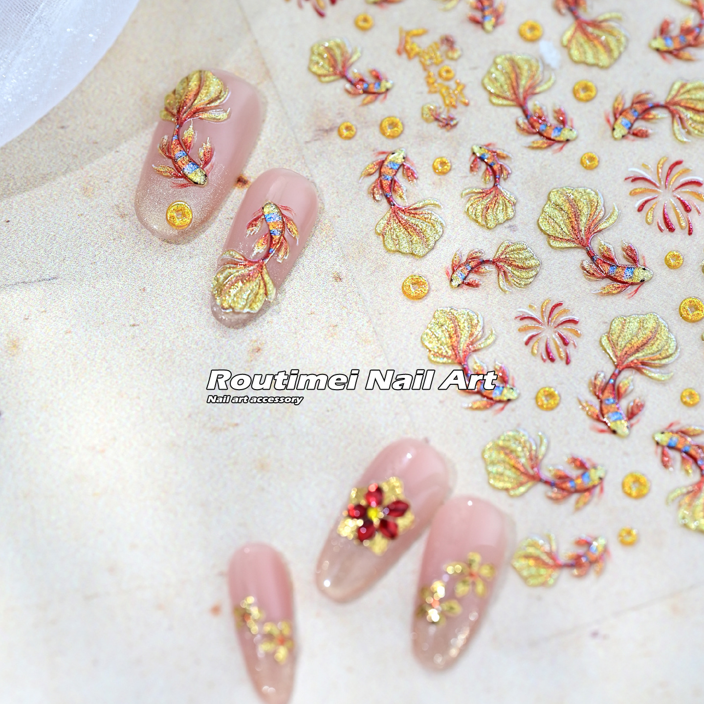 ネイルアートステッカー 新しい赤鯉金魚シリーズ レリーフ立体ゼリースタイル 財運を引き寄せる粘着裏地付き 小さな鯉