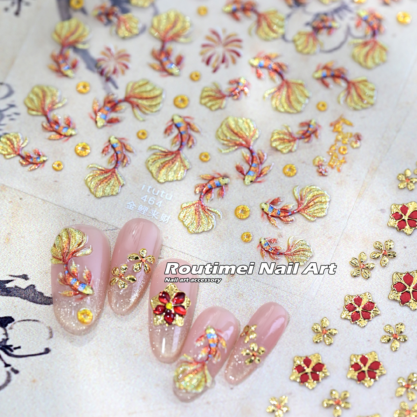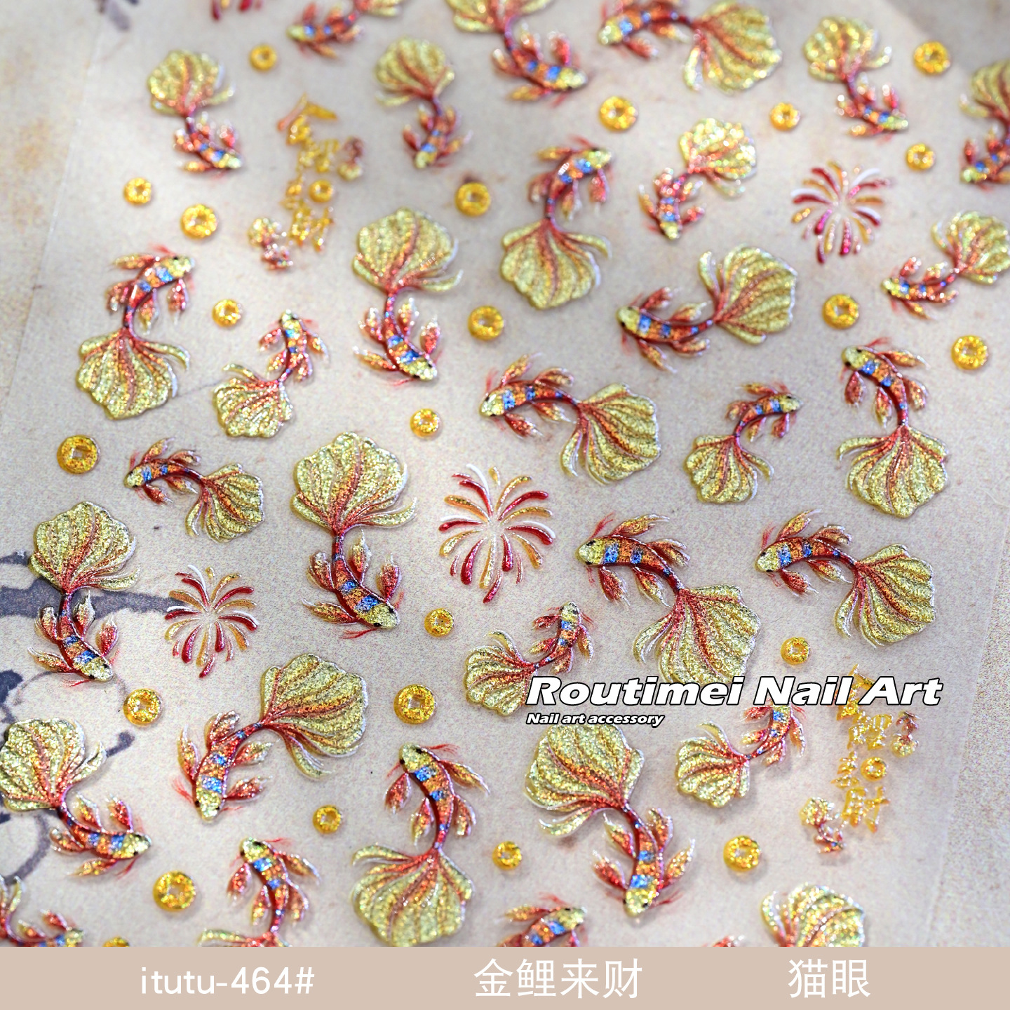 itutu新款金鲤来财浮雕美甲贴纸烫金人间富贵金花上岸锦鲤图案464